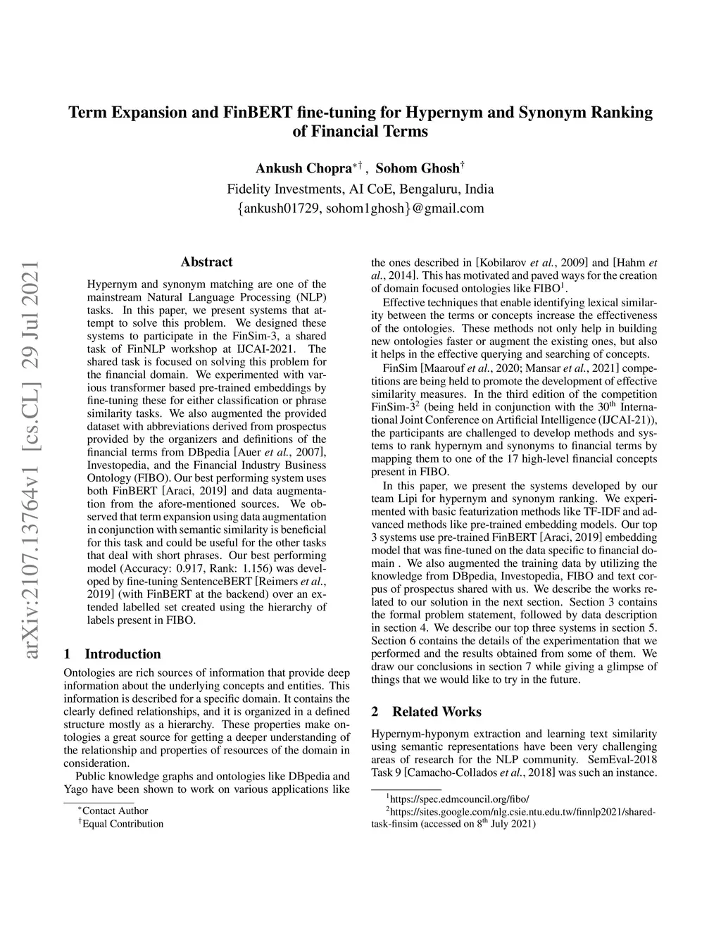 Hypernym and synonym matching are one of the mainstream Natural Language Processing (NLP) tasks. In this paper, we present systems that attempt to solve this problem. We designed these systems to participate in the FinSim-3, a shared task of FinNLP workshop at IJCAI-2021. The shared task is focused on solving this problem for the financial domain. We experimented with various transformer based pre-trained embeddings by fine-tuning these for either classification or phrase similarity tasks. We also augmented the provided dataset with abbreviations derived from prospectus provided by the organizers and definitions of the financial terms from DBpedia [Auer et al., 2007], Investopedia, and the Financial Industry Business Ontology (FIBO). Our best performing system uses both FinBERT [Araci, 2019] and data augmentation from the afore-mentioned sources. We observed that term expansion using data augmentation in conjunction with semantic similarity is beneficial for this task and could be useful for the other tasks that deal with short phrases. Our best performing model (Accuracy: 0.917, Rank: 1.156) was developed by fine-tuning SentenceBERT [Reimers et al., 2019] (with FinBERT at the backend) over an extended labelled set created using the hierarchy of labels present in FIBO.