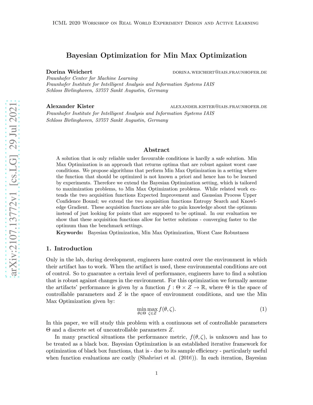 A solution that is only reliable under favourable conditions is hardly a safe solution. Min Max Optimization is an approach that returns optima that are robust against worst case conditions. We propose algorithms that perform Min Max Optimization in a setting where the function that should be optimized is not known a priori and hence has to be learned by experiments. Therefore we extend the Bayesian Optimization setting, which is tailored to maximization problems, to Min Max Optimization problems. While related work extends the two acquisition functions Expected Improvement and Gaussian Process Upper Confidence Bound; we extend the two acquisition functions Entropy Search and Knowledge Gradient. These acquisition functions are able to gain knowledge about the optimum instead of just looking for points that are supposed to be optimal. In our evaluation we show that these acquisition functions allow for better solutions - converging faster to the optimum than the benchmark settings.