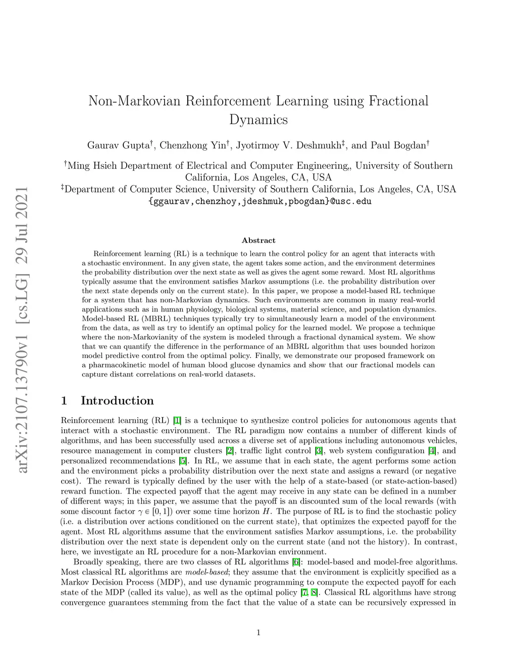 Non-Markovian Reinforcement Learning using Fractional Dynamics