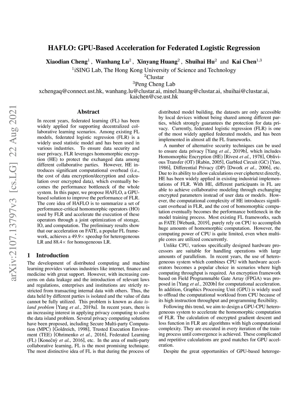 In recent years, federated learning (FL) has been widely applied for supporting decentralized collaborative learning scenarios. Among existing FL models, federated logistic regression (FLR) is a widely used statistic model and has been used in various industries. To ensure data security and user privacy, FLR leverages homomorphic encryption (HE) to protect the exchanged data among different collaborative parties. However, HE introduces significant computational overhead (i.e., the cost of data encryption/decryption and calculation over encrypted data), which eventually becomes the performance bottleneck of the whole system. In this paper, we propose HAFLO, a GPU-based solution to improve the performance of FLR. The core idea of HAFLO is to summarize a set of performance-critical homomorphic operators (HO) used by FLR and accelerate the execution of these operators through a joint optimization of storage, IO, and computation. The preliminary results show that our acceleration on FATE, a popular FL framework, achieves a 49.9 speedup for heterogeneous LR and 88.4 for homogeneous LR.