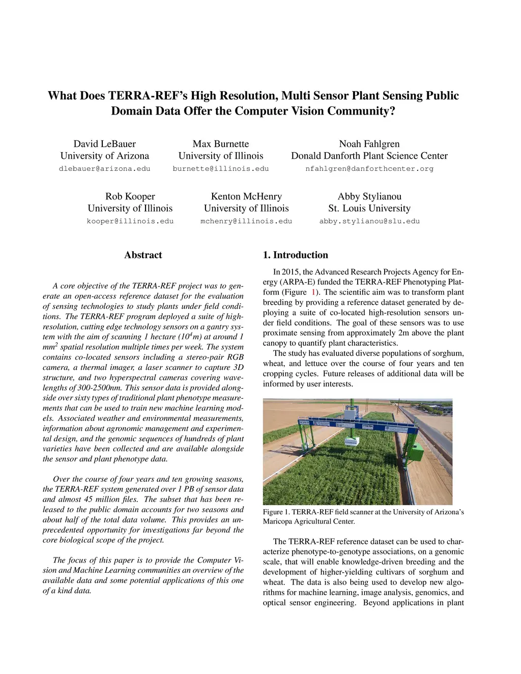 A core objective of the TERRA-REF project was to generate an open-access reference dataset for the evaluation of sensing technologies to study plants under field conditions. The TERRA-REF program deployed a suite of high-resolution, cutting edge technology sensors on a gantry system with the aim of scanning 1 hectare (10) at around 1 mm spatial resolution multiple times per week. The system contains co-located sensors including a stereo-pair RGB camera, a thermal imager, a laser scanner to capture 3D structure, and two hyperspectral cameras covering wavelengths of 300-2500nm. This sensor data is provided alongside over sixty types of traditional plant phenotype measurements that can be used to train new machine learning models. Associated weather and environmental measurements, information about agronomic management and experimental design, and the genomic sequences of hundreds of plant varieties have been collected and are available alongside the sensor and plant phenotype data. Over the course of four years and ten growing seasons, the TERRA-REF system generated over 1 PB of sensor data and almost 45 million files. The subset that has been released to the public domain accounts for two seasons and about half of the total data volume. This provides an unprecedented opportunity for investigations far beyond the core biological scope of the project. The focus of this paper is to provide the Computer Vision and Machine Learning communities an overview of the available data and some potential applications of this one of a kind data.