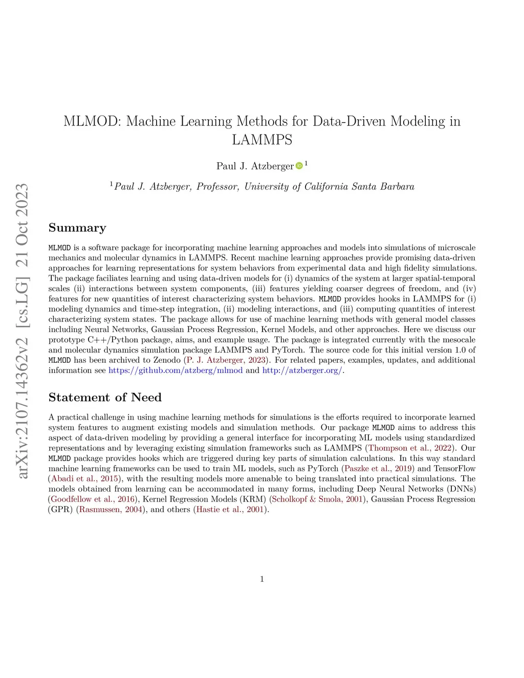 MLMOD: Machine Learning Methods for Data-Driven Modeling in LAMMPS