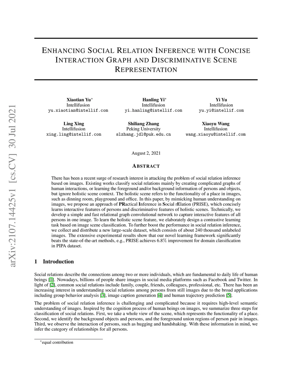 There has been a recent surge of research interest in attacking the problem of social relation inference based on images. Existing works classify social relations mainly by creating complicated graphs of human interactions, or learning the foreground and/or background information of persons and objects, but ignore holistic scene context. The holistic scene refers to the functionality of a place in images, such as dinning room, playground and office. In this paper, by mimicking human understanding on images, we propose an approach of \textbf{PR}actical \textbf{I}nference in \textbf{S}ocial r\textbf{E}lation (PRISE), which concisely learns interactive features of persons and discriminative features of holistic scenes. Technically, we develop a simple and fast relational graph convolutional network to capture interactive features of all persons in one image. To learn the holistic scene feature, we elaborately design a contrastive learning task based on image scene classification. To further boost the performance in social relation inference, we collect and distribute a new large-scale dataset, which consists of about 240 thousand unlabeled images. The extensive experimental results show that our novel learning framework significantly beats the state-of-the-art methods, e.g., PRISE achieves 6.8 improvement for domain classification in PIPA dataset.