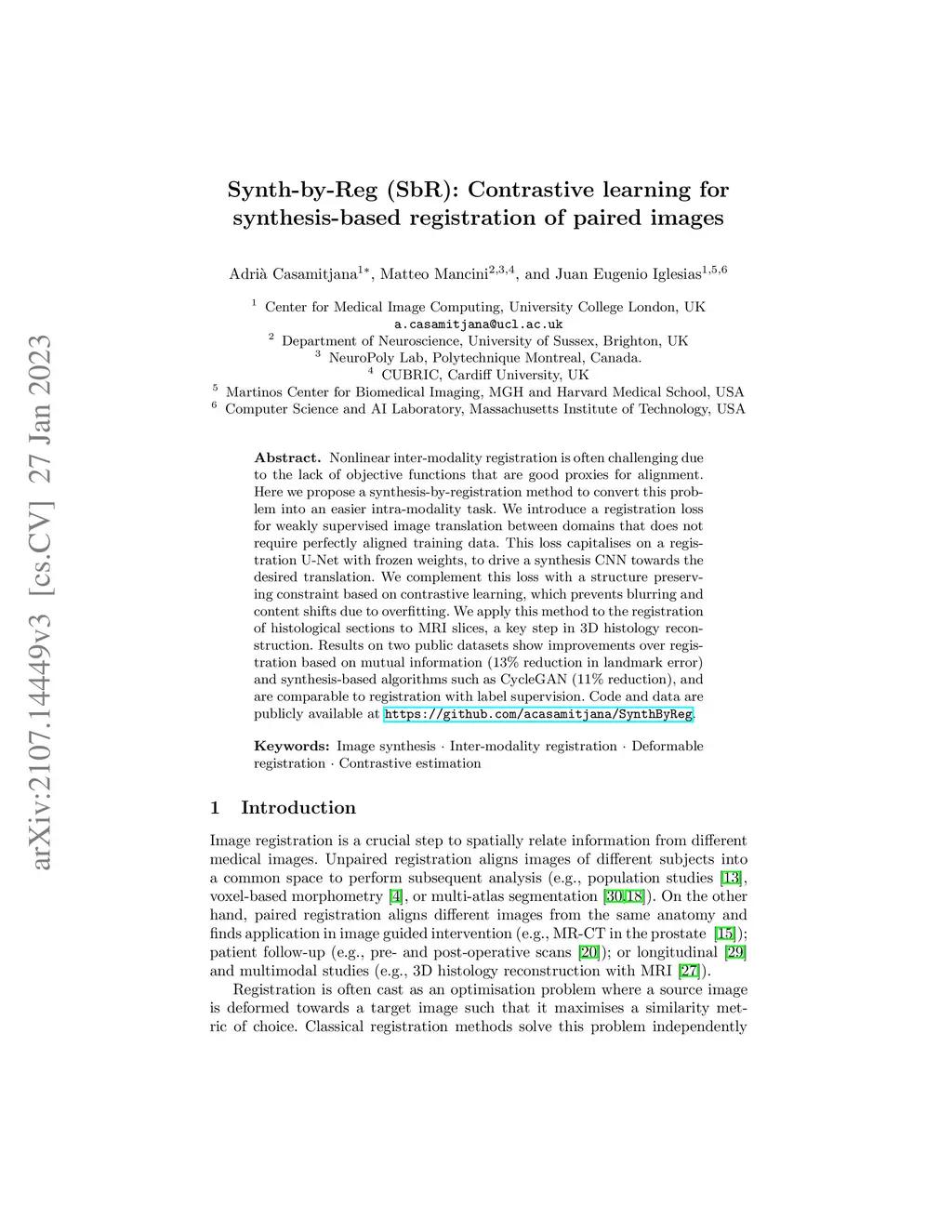 Synth-by-Reg (SbR): Contrastive learning for synthesis-based