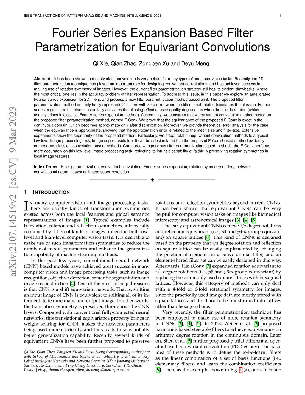 It has been shown that equivariant convolution is very helpful for many types of computer vision tasks. Recently, the 2D filter parametrization technique plays an important role when designing equivariant convolutions. However, the current filter parametrization method still has its evident drawbacks, where the most critical one lies in the accuracy problem of filter representation. Against this issue, in this paper we modify the classical Fourier series expansion for 2D filters, and propose a new set of atomic basis functions for filter parametrization. The proposed filter parametrization method not only finely represents 2D filters with zero error when the filter is not rotated, but also substantially alleviates the fence-effect-caused quality degradation when the filter is rotated. Accordingly, we construct a new equivariant convolution method based on the proposed filter parametrization method, named F-Conv. We prove that the equivariance of the proposed F-Conv is exact in the continuous domain, which becomes approximate only after discretization. Extensive experiments show the superiority of the proposed method. Particularly, we adopt rotation equivariant convolution methods to image super-resolution task, and F-Conv evidently outperforms previous filter parametrization based method in this task, reflecting its intrinsic capability of faithfully preserving rotation symmetries in local image features.