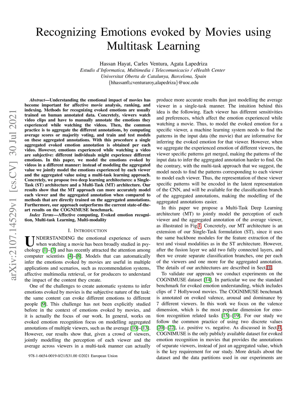 Understanding the emotional impact of movies has become important for affective movie analysis, ranking, and indexing. Methods for recognizing evoked emotions are usually trained on human annotated data. Concretely, viewers watch video clips and have to manually annotate the emotions they experienced while watching the videos. Then, the common practice is to aggregate the different annotations, by computing average scores or majority voting, and train and test models on these aggregated annotations. With this procedure a single aggregated evoked emotion annotation is obtained per each video. However, emotions experienced while watching a video are subjective: different individuals might experience different emotions. In this paper, we model the emotions evoked by videos in a different manner: instead of modeling the aggregated value we jointly model the emotions experienced by each viewer and the aggregated value using a multi-task learning approach. Concretely, we propose two deep learning architectures: a Single-Task (ST) architecture and a Multi-Task (MT) architecture. Our results show that the MT approach can more accurately model each viewer and the aggregated annotation when compared to methods that are directly trained on the aggregated annotations. Furthermore, our approach outperforms the current state-of-the-art results on the COGNIMUSE benchmark.