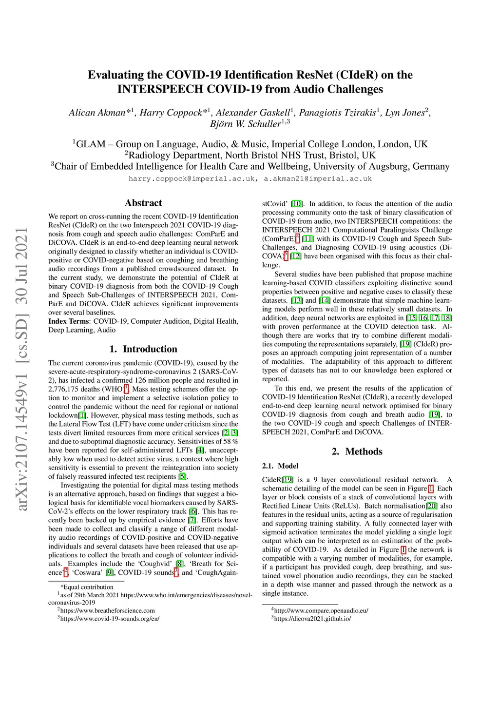 We report on cross-running the recent COVID-19 Identification ResNet (CIdeR) on the two Interspeech 2021 COVID-19 diagnosis from cough and speech audio challenges: ComParE and DiCOVA. CIdeR is an end-to-end deep learning neural network originally designed to classify whether an individual is COVID-positive or COVID-negative based on coughing and breathing audio recordings from a published crowdsourced dataset. In the current study, we demonstrate the potential of CIdeR at binary COVID-19 diagnosis from both the COVID-19 Cough and Speech Sub-Challenges of INTERSPEECH 2021, ComParE and DiCOVA. CIdeR achieves significant improvements over several baselines.