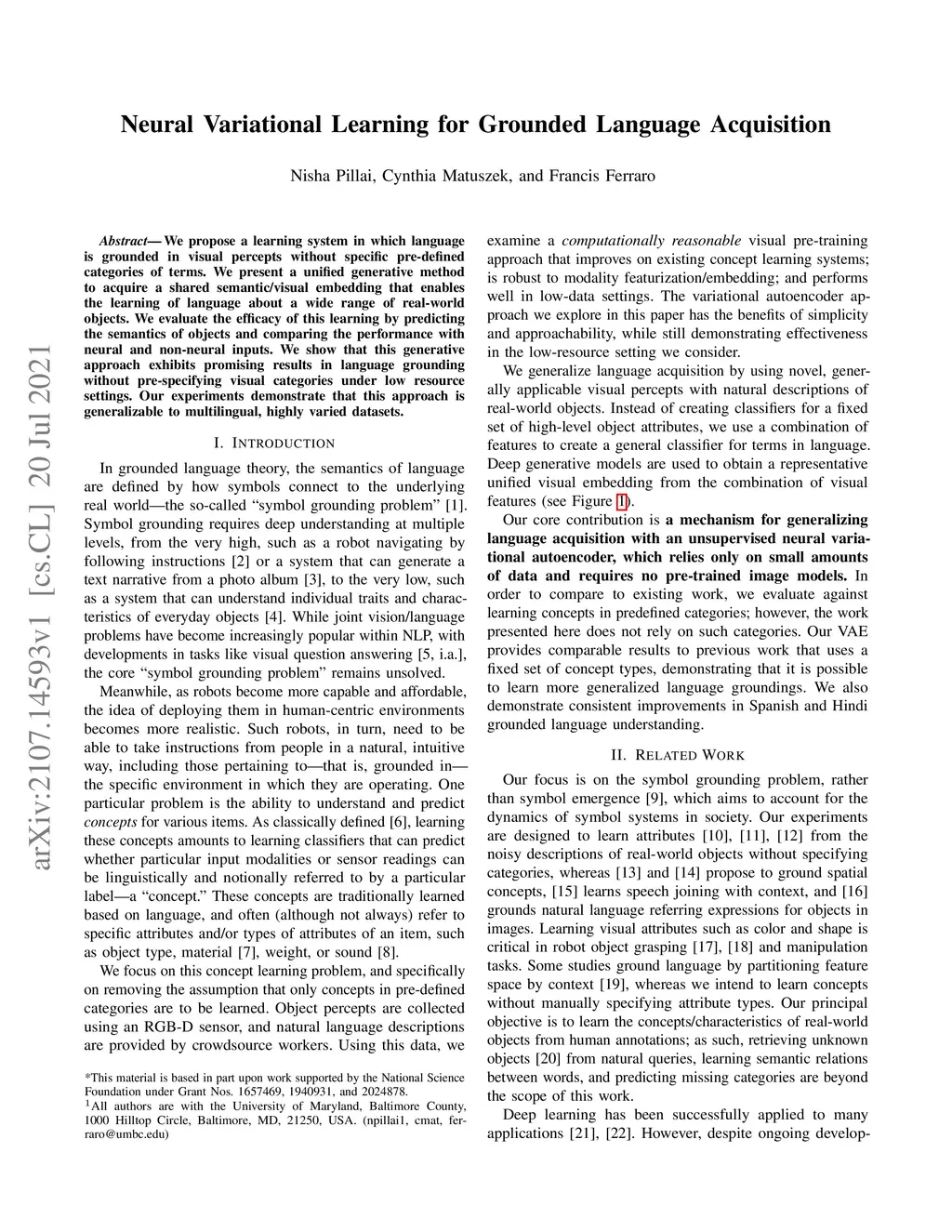 We propose a learning system in which language is grounded in visual percepts without specific pre-defined categories of terms. We present a unified generative method to acquire a shared semantic/visual embedding that enables the learning of language about a wide range of real-world objects. We evaluate the efficacy of this learning by predicting the semantics of objects and comparing the performance with neural and non-neural inputs. We show that this generative approach exhibits promising results in language grounding without pre-specifying visual categories under low resource settings. Our experiments demonstrate that this approach is generalizable to multilingual, highly varied datasets.