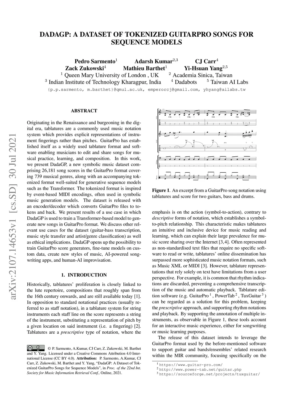 Originating in the Renaissance and burgeoning in the digital era, tablatures are a commonly used music notation system which provides explicit representations of instrument fingerings rather than pitches. GuitarPro has established itself as a widely used tablature format and software enabling musicians to edit and share songs for musical practice, learning, and composition. In this work, we present DadaGP, a new symbolic music dataset comprising 26,181 song scores in the GuitarPro format covering 739 musical genres, along with an accompanying tokenized format well-suited for generative sequence models such as the Transformer. The tokenized format is inspired by event-based MIDI encodings, often used in symbolic music generation models. The dataset is released with an encoder/decoder which converts GuitarPro files to tokens and back. We present results of a use case in which DadaGP is used to train a Transformer-based model to generate new songs in GuitarPro format. We discuss other relevant use cases for the dataset (guitar-bass transcription, music style transfer and artist/genre classification) as well as ethical implications. DadaGP opens up the possibility to train GuitarPro score generators, fine-tune models on custom data, create new styles of music, AI-powered songwriting apps, and human-AI improvisation.