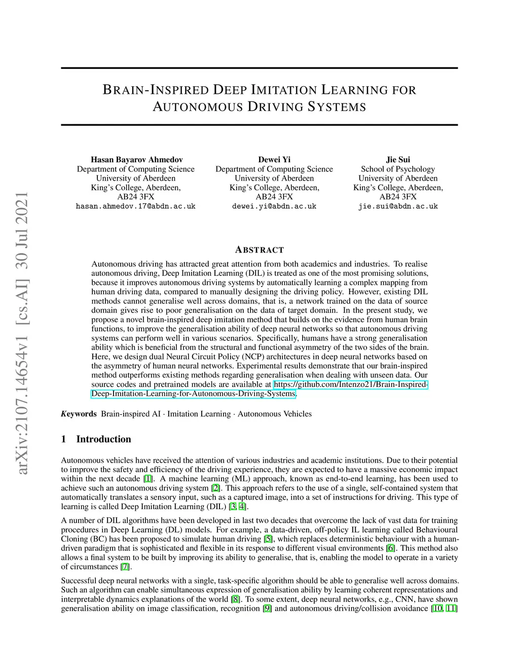 Autonomous driving has attracted great attention from both academics and industries. To realise autonomous driving, Deep Imitation Learning (DIL) is treated as one of the most promising solutions, because it improves autonomous driving systems by automatically learning a complex mapping from human driving data, compared to manually designing the driving policy. However, existing DIL methods cannot generalise well across domains, that is, a network trained on the data of source domain gives rise to poor generalisation on the data of target domain. In the present study, we propose a novel brain-inspired deep imitation method that builds on the evidence from human brain functions, to improve the generalisation ability of deep neural networks so that autonomous driving systems can perform well in various scenarios. Specifically, humans have a strong generalisation ability which is beneficial from the structural and functional asymmetry of the two sides of the brain. Here, we design dual Neural Circuit Policy (NCP) architectures in deep neural networks based on the asymmetry of human neural networks. Experimental results demonstrate that our brain-inspired method outperforms existing methods regarding generalisation when dealing with unseen data. Our source codes and pretrained models are available at https://github.com/Intenzo21/Brain-Inspired-Deep-Imitation-Learning-for-Autonomous-Driving-Systems}{https://github.com/Intenzo21/Brain-Inspired-Deep-Imitation-Learning-for-Autonomous-Driving-Systems.