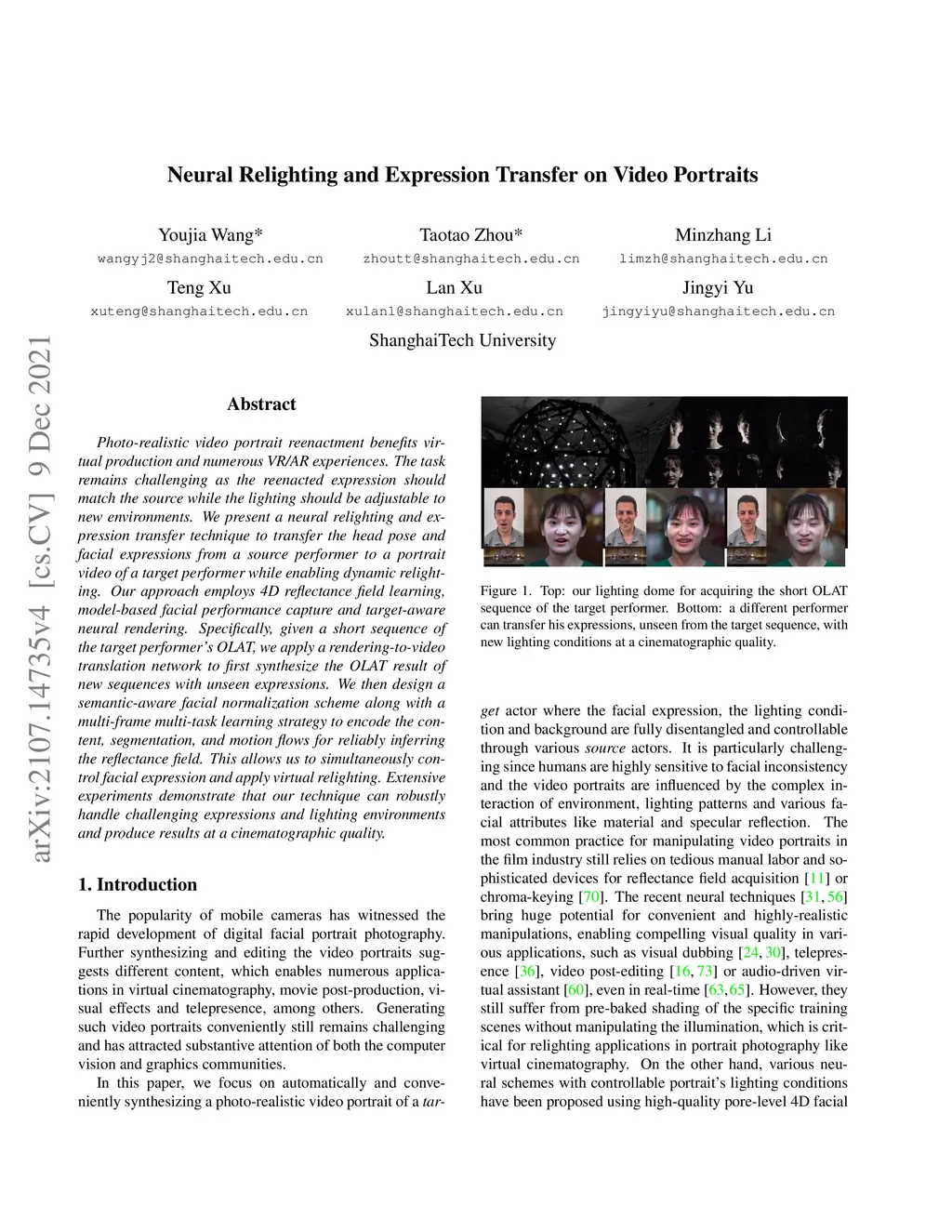 Photo-realistic video portrait reenactment benefits virtual production and numerous VR/AR experiences. The task remains challenging as the reenacted expression should match the source while the lighting should be adjustable to new environments. We present a neural relighting and expression transfer technique to transfer the facial expressions from a source performer to a portrait video of a target performer while enabling dynamic relighting. Our approach employs 4D reflectance field learning, model-based facial performance capture and target-aware neural rendering. Specifically, given a short sequence of the target performer's OLAT, we apply a rendering-to-video translation network to first synthesize the OLAT result of new sequences with unseen expressions. We then design a semantic-aware facial normalization scheme along with a multi-frame multi-task learning strategy to encode the content, segmentation, and motion flows for reliably inferring the reflectance field. This allows us to simultaneously control facial expression and apply virtual relighting. Extensive experiments demonstrate that our technique can robustly handle challenging expressions and lighting environments and produce results at a cinematographic quality.