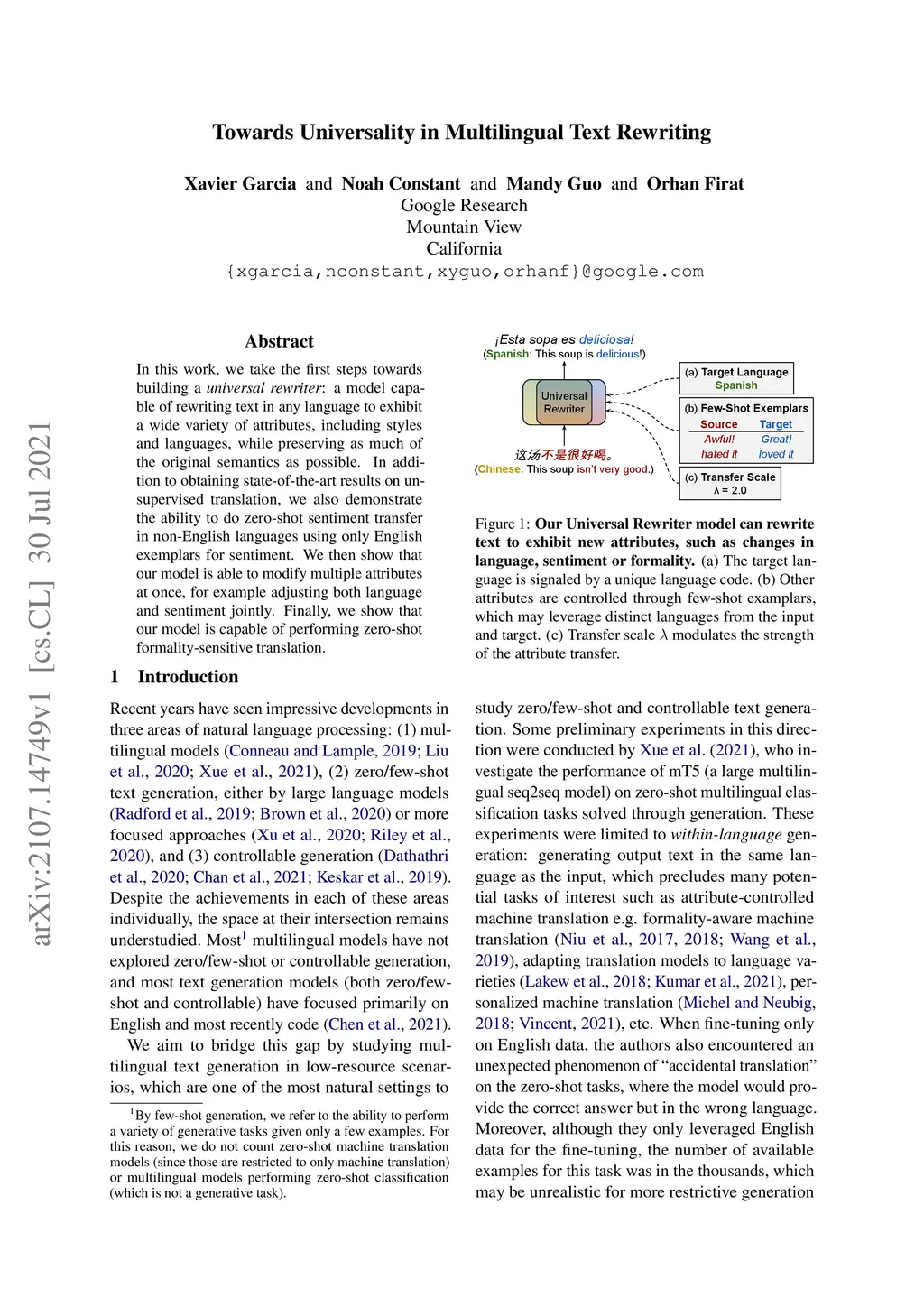 In this work, we take the first steps towards building a universal rewriter: a model capable of rewriting text in any language to exhibit a wide variety of attributes, including styles and languages, while preserving as much of the original semantics as possible. In addition to obtaining state-of-the-art results on unsupervised translation, we also demonstrate the ability to do zero-shot sentiment transfer in non-English languages using only English exemplars for sentiment. We then show that our model is able to modify multiple attributes at once, for example adjusting both language and sentiment jointly. Finally, we show that our model is capable of performing zero-shot formality-sensitive translation.