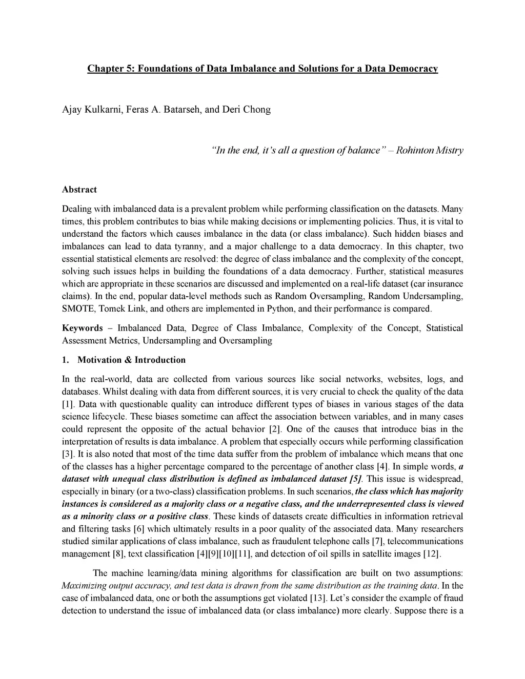 Dealing with imbalanced data is a prevalent problem while performing classification on the datasets. Many times, this problem contributes to bias while making decisions or implementing policies. Thus, it is vital to understand the factors which cause imbalance in the data (or class imbalance). Such hidden biases and imbalances can lead to data tyranny and a major challenge to a data democracy. In this chapter, two essential statistical elements are resolved: the degree of class imbalance and the complexity of the concept; solving such issues helps in building the foundations of a data democracy. Furthermore, statistical measures which are appropriate in these scenarios are discussed and implemented on a real-life dataset (car insurance claims). In the end, popular data-level methods such as random oversampling, random undersampling, synthetic minority oversampling technique, Tomek link, and others are implemented in Python, and their performance is compared.