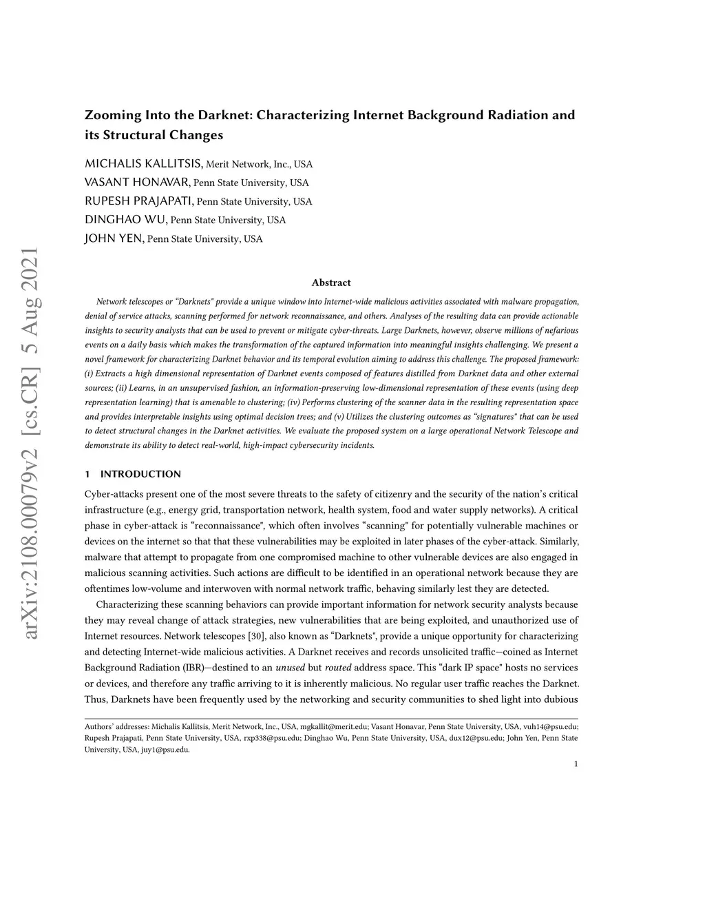 Network telescopes or "Darknets" provide a unique window into Internet-wide malicious activities associated with malware propagation, denial of service attacks, scanning performed for network reconnaissance, and others. Analyses of the resulting data can provide actionable insights to security analysts that can be used to prevent or mitigate cyber-threats. Large Darknets, however, observe millions of nefarious events on a daily basis which makes the transformation of the captured information into meaningful insights challenging. We present a novel framework for characterizing Darknet behavior and its temporal evolution aiming to address this challenge. The proposed framework: (i) Extracts a high dimensional representation of Darknet events composed of features distilled from Darknet data and other external sources; (ii) Learns, in an unsupervised fashion, an information-preserving low-dimensional representation of these events (using deep representation learning) that is amenable to clustering; (iv) Performs clustering of the scanner data in the resulting representation space and provides interpretable insights using optimal decision trees; and (v) Utilizes the clustering outcomes as "signatures" that can be used to detect structural changes in the Darknet activities. We evaluate the proposed system on a large operational Network Telescope and demonstrate its ability to detect real-world, high-impact cybersecurity incidents.
