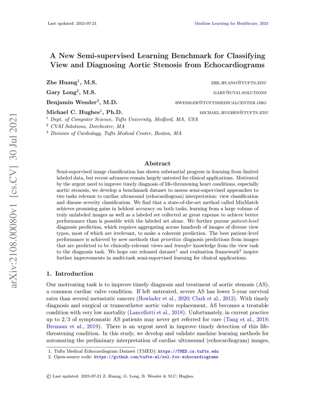 Semi-supervised image classification has shown substantial progress in learning from limited labeled data, but recent advances remain largely untested for clinical applications. Motivated by the urgent need to improve timely diagnosis of life-threatening heart conditions, especially aortic stenosis, we develop a benchmark dataset to assess semi-supervised approaches to two tasks relevant to cardiac ultrasound (echocardiogram) interpretation: view classification and disease severity classification. We find that a state-of-the-art method called MixMatch achieves promising gains in heldout accuracy on both tasks, learning from a large volume of truly unlabeled images as well as a labeled set collected at great expense to achieve better performance than is possible with the labeled set alone. We further pursue patient-level diagnosis prediction, which requires aggregating across hundreds of images of diverse view types, most of which are irrelevant, to make a coherent prediction. The best patient-level performance is achieved by new methods that prioritize diagnosis predictions from images that are predicted to be clinically-relevant views and transfer knowledge from the view task to the diagnosis task. We hope our released Tufts Medical Echocardiogram Dataset and evaluation framework inspire further improvements in multi-task semi-supervised learning for clinical applications.