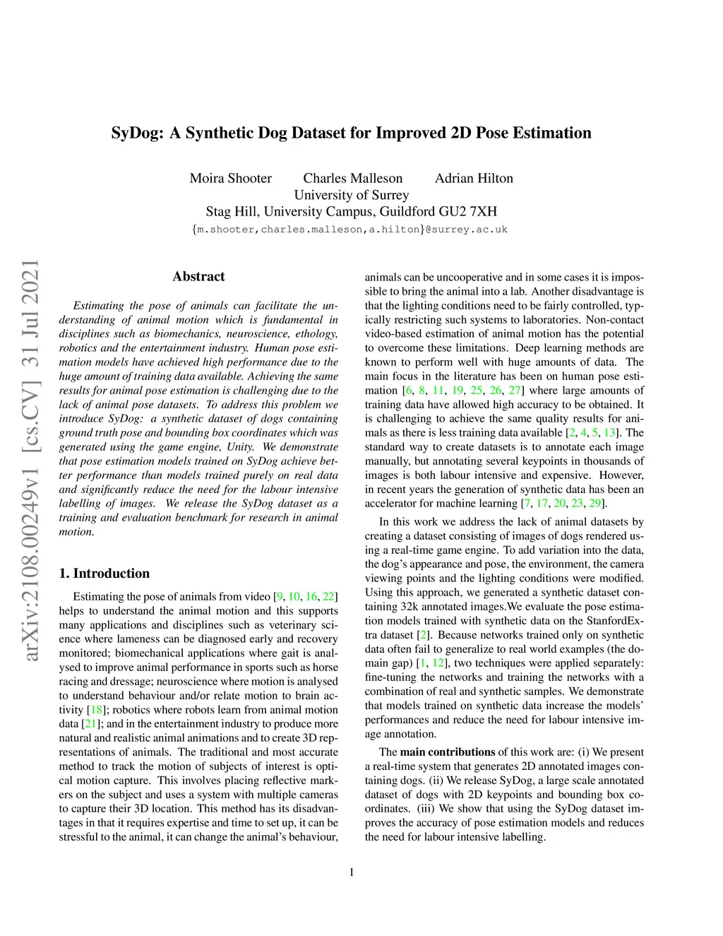 Estimating the pose of animals can facilitate the understanding of animal motion which is fundamental in disciplines such as biomechanics, neuroscience, ethology, robotics and the entertainment industry. Human pose estimation models have achieved high performance due to the huge amount of training data available. Achieving the same results for animal pose estimation is challenging due to the lack of animal pose datasets. To address this problem we introduce SyDog: a synthetic dataset of dogs containing ground truth pose and bounding box coordinates which was generated using the game engine, Unity. We demonstrate that pose estimation models trained on SyDog achieve better performance than models trained purely on real data and significantly reduce the need for the labour intensive labelling of images. We release the SyDog dataset as a training and evaluation benchmark for research in animal motion.