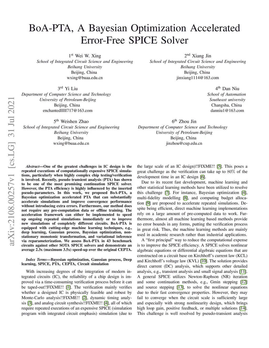 BoA-PTA, A Bayesian Optimization Accelerated Error-Free SPICE Solver