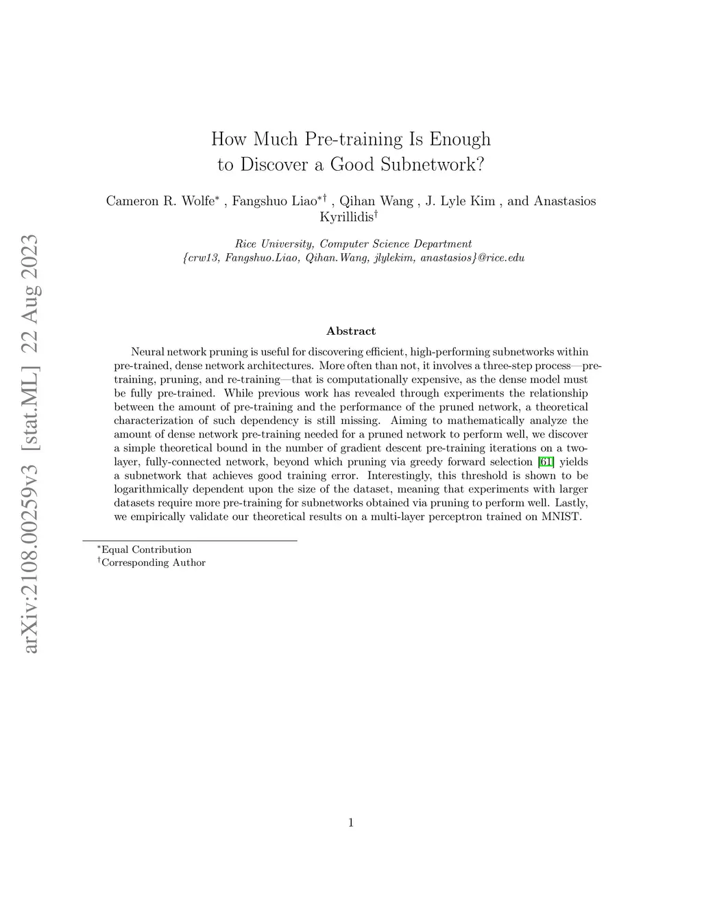 Neural network pruning is useful for discovering efficient, high-performing subnetworks within pre-trained, dense network architectures. More often than not, it involves a three-step process -- pre-training, pruning, and re-training -- that is computationally expensive, as the dense model must be fully pre-trained. While previous work has revealed through experiments the relationship between the amount of pre-training and the performance of the pruned network, a theoretical characterization of such dependency is still missing. Aiming to mathematically analyze the amount of dense network pre-training needed for a pruned network to perform well, we discover a simple theoretical bound in the number of gradient descent pre-training iterations on a two-layer, fully-connected network, beyond which pruning via greedy forward selection [61] yields a subnetwork that achieves good training error. Interestingly, this threshold is shown to be logarithmically dependent upon the size of the dataset, meaning that experiments with larger datasets require more pre-training for subnetworks obtained via pruning to perform well. Lastly, we empirically validate our theoretical results on a multi-layer perceptron trained on MNIST.