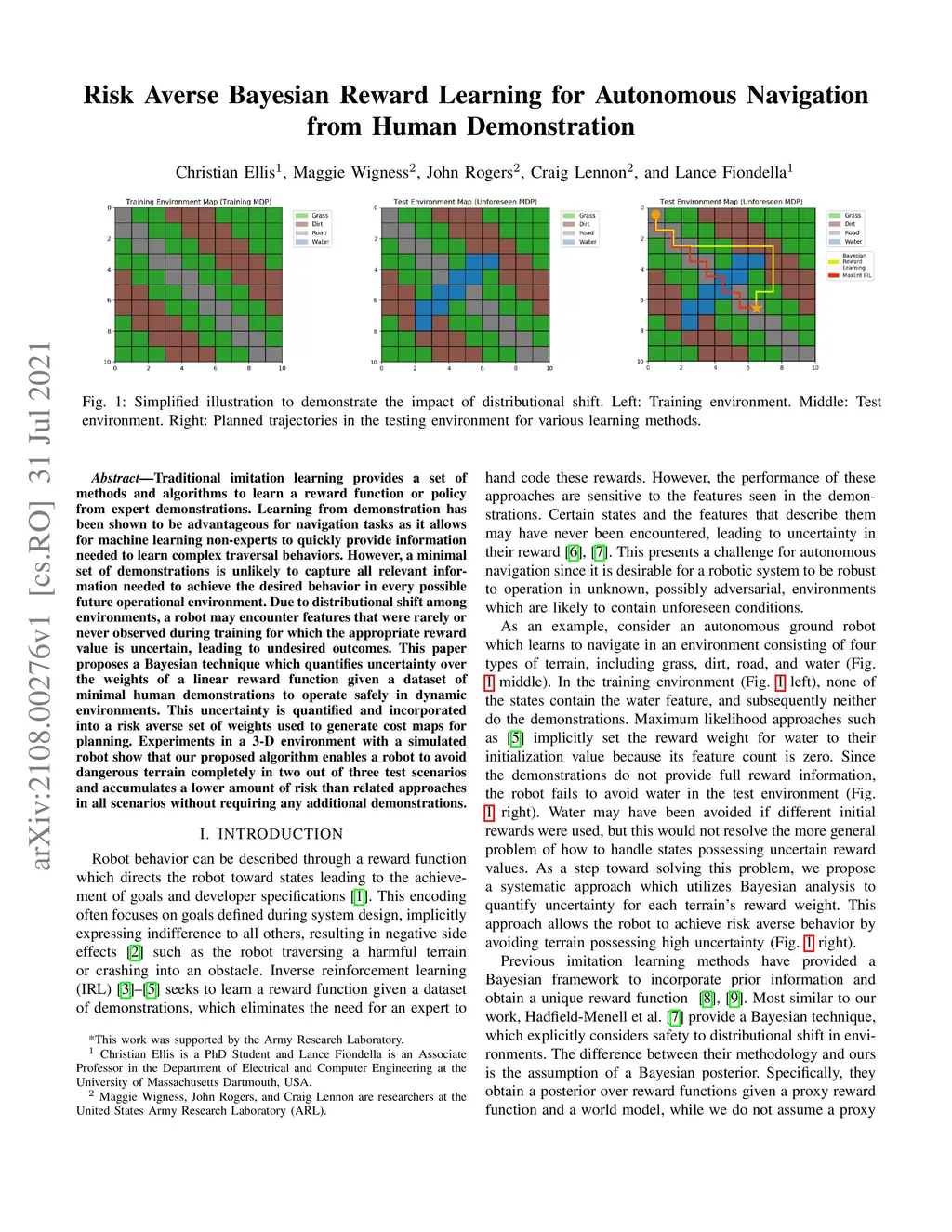 Risk Averse Bayesian Reward Learning for Autonomous Navigation from