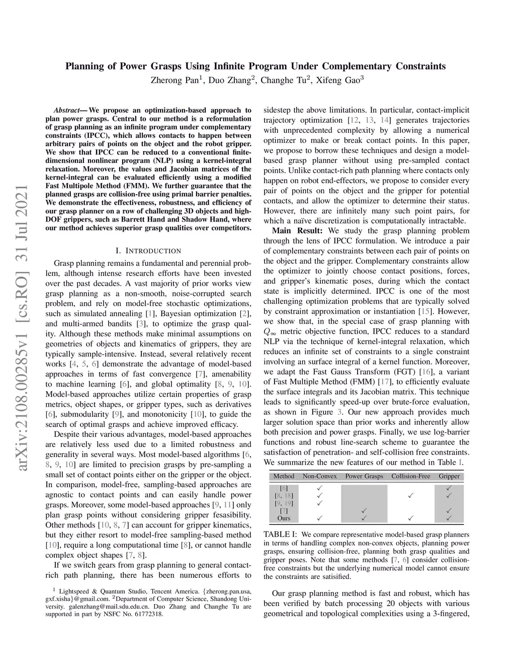 We propose an optimization-based approach to plan power grasps. Central to our method is a reformulation of grasp planning as an infinite program under complementary constraints (IPCC), which allows contacts to happen between arbitrary pairs of points on the object and the robot gripper. We show that IPCC can be reduced to a conventional finite-dimensional nonlinear program (NLP) using a kernel-integral relaxation. Moreover, the values and Jacobian matrices of the kernel-integral can be evaluated efficiently using a modified Fast Multipole Method (FMM). We further guarantee that the planned grasps are collision-free using primal barrier penalties. We demonstrate the effectiveness, robustness, and efficiency of our grasp planner on a row of challenging 3D objects and high-DOF grippers, such as Barrett Hand and Shadow Hand, where our method achieves superior grasp qualities over competitors.