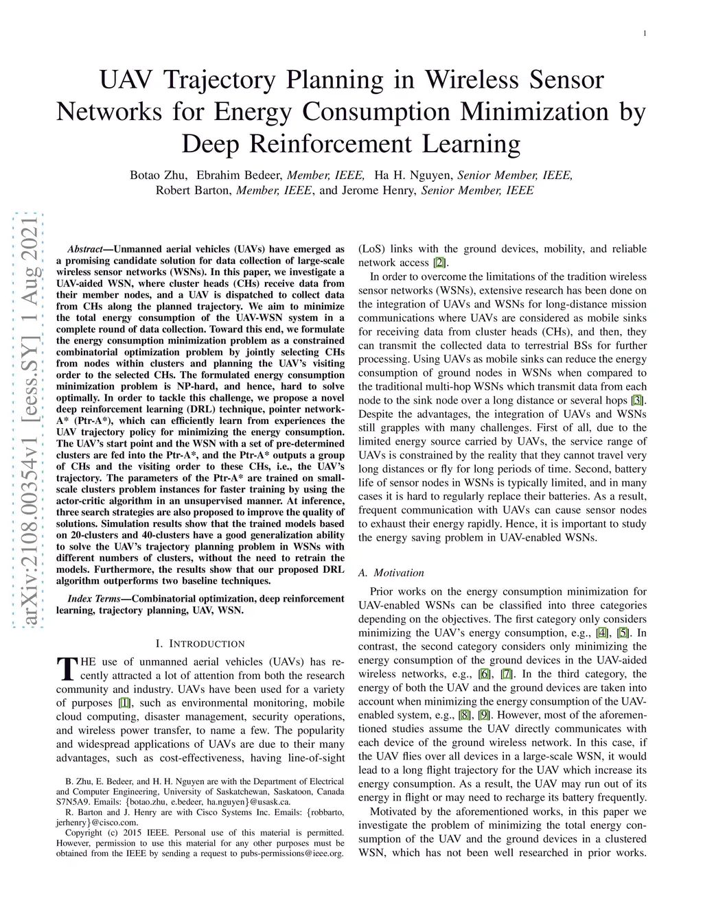 Unmanned aerial vehicles (UAVs) have emerged as a promising candidate solution for data collection of large-scale wireless sensor networks (WSNs). In this paper, we investigate a UAV-aided WSN, where cluster heads (CHs) receive data from their member nodes, and a UAV is dispatched to collect data from CHs along the planned trajectory. We aim to minimize the total energy consumption of the UAV-WSN system in a complete round of data collection. Toward this end, we formulate the energy consumption minimization problem as a constrained combinatorial optimization problem by jointly selecting CHs from nodes within clusters and planning the UAV's visiting order to the selected CHs. The formulated energy consumption minimization problem is NP-hard, and hence, hard to solve optimally. In order to tackle this challenge, we propose a novel deep reinforcement learning (DRL) technique, pointer network-A* (Ptr-A*), which can efficiently learn from experiences the UAV trajectory policy for minimizing the energy consumption. The UAV's start point and the WSN with a set of pre-determined clusters are fed into the Ptr-A*, and the Ptr-A* outputs a group of CHs and the visiting order to these CHs, i.e., the UAV's trajectory. The parameters of the Ptr-A* are trained on small-scale clusters problem instances for faster training by using the actor-critic algorithm in an unsupervised manner. At inference, three search strategies are also proposed to improve the quality of solutions. Simulation results show that the trained models based on 20-clusters and 40-clusters have a good generalization ability to solve the UAV's trajectory planning problem in WSNs with different numbers of clusters, without the need to retrain the models. Furthermore, the results show that our proposed DRL algorithm outperforms two baseline techniques.