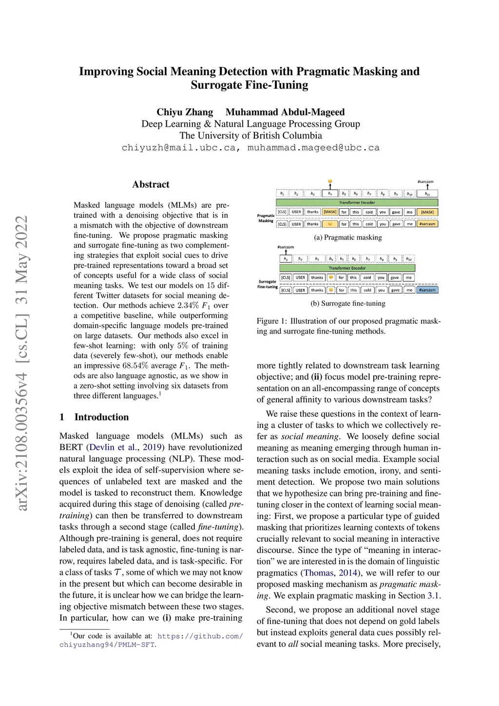 Improving Social Meaning Detection with Pragmatic Masking and Surrogate