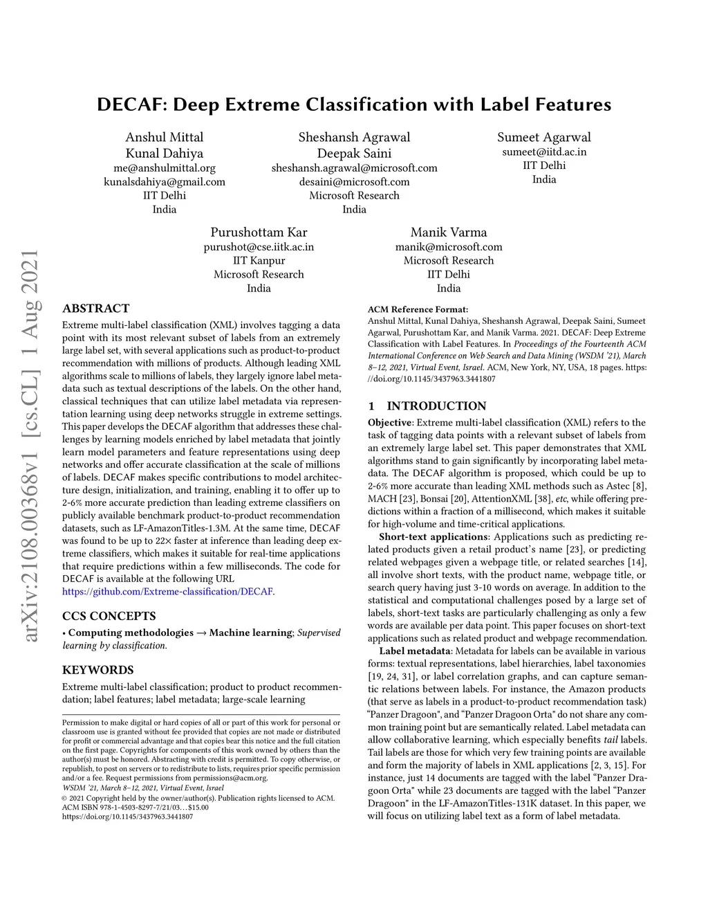 DECAF: Deep Extreme Classification with Label Features