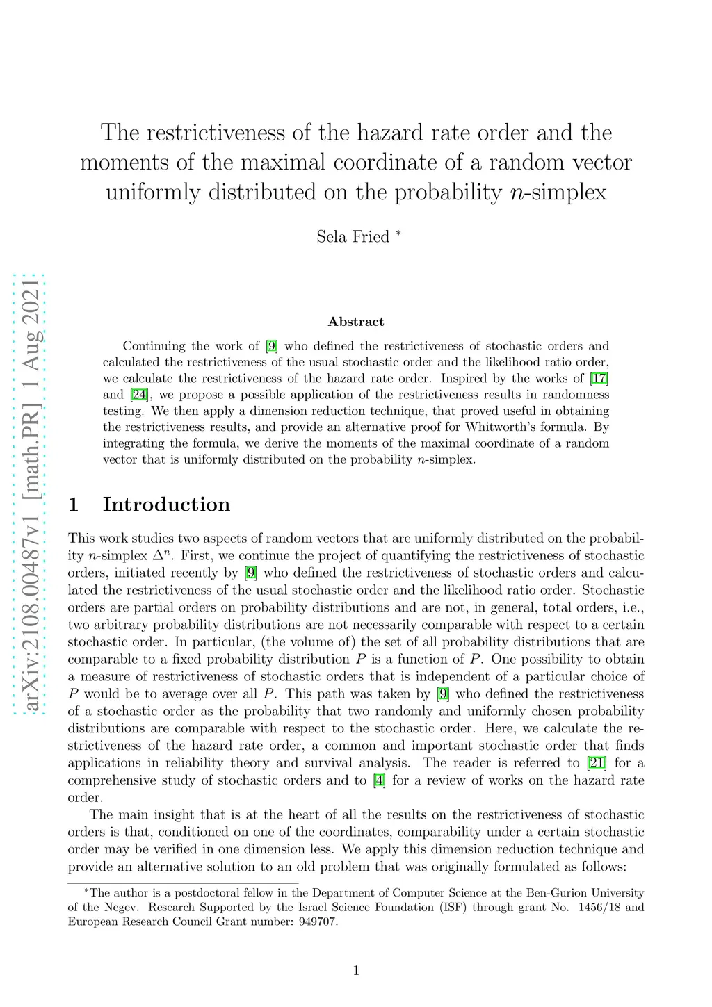Continuing the work of [9] who defined the restrictiveness of stochastic orders and calculated the restrictiveness of the usual stochastic order and the likelihood ratio order, we calculate the restrictiveness of the hazard rate order. Inspired by the works of [17] and [24], we propose a possible application of the restrictiveness results in randomness testing. We then apply a dimension reduction technique, that proved useful in obtaining the restrictiveness results, and provide an alternative proof for Whitworth's formula. By integrating the formula, we derive the moments of the maximal coordinate of a random vector that is uniformly distributed on the probability -simplex.