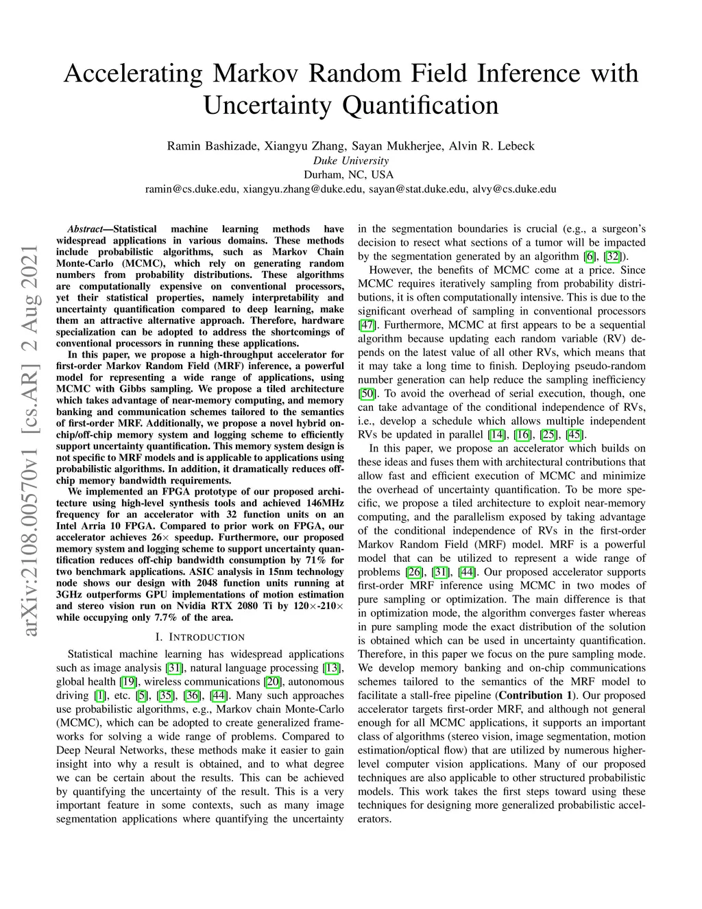 Statistical machine learning has widespread application in various domains. These methods include probabilistic algorithms, such as Markov Chain Monte-Carlo (MCMC), which rely on generating random numbers from probability distributions. These algorithms are computationally expensive on conventional processors, yet their statistical properties, namely interpretability and uncertainty quantification (UQ) compared to deep learning, make them an attractive alternative approach. Therefore, hardware specialization can be adopted to address the shortcomings of conventional processors in running these applications. In this paper, we propose a high-throughput accelerator for Markov Random Field (MRF) inference, a powerful model for representing a wide range of applications, using MCMC with Gibbs sampling. We propose a tiled architecture which takes advantage of near-memory computing, and memory optimizations tailored to the semantics of MRF. Additionally, we propose a novel hybrid on-chip/off-chip memory system and logging scheme to efficiently support UQ. This memory system design is not specific to MRF models and is applicable to applications using probabilistic algorithms. In addition, it dramatically reduces off-chip memory bandwidth requirements. We implemented an FPGA prototype of our proposed architecture using high-level synthesis tools and achieved 146MHz frequency for an accelerator with 32 function units on an Intel Arria 10 FPGA. Compared to prior work on FPGA, our accelerator achieves 26X speedup. Furthermore, our proposed memory system and logging scheme to support UQ reduces off-chip bandwidth by 71% for two applications. ASIC analysis in 15nm shows our design with 2048 function units running at 3GHz outperforms GPU implementations of motion estimation and stereo vision on Nvidia RTX2080Ti by 120X-210X, occupying only 7.7% of the area.