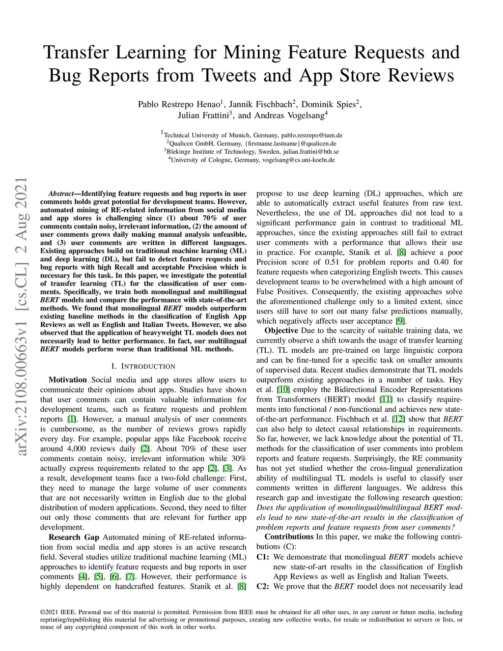 Identifying feature requests and bug reports in user comments holds great potential for development teams. However, automated mining of RE-related information from social media and app stores is challenging since (1) about 70% of user comments contain noisy, irrelevant information, (2) the amount of user comments grows daily making manual analysis unfeasible, and (3) user comments are written in different languages. Existing approaches build on traditional machine learning (ML) and deep learning (DL), but fail to detect feature requests and bug reports with high Recall and acceptable Precision which is necessary for this task. In this paper, we investigate the potential of transfer learning (TL) for the classification of user comments. Specifically, we train both monolingual and multilingual BERT models and compare the performance with state-of-the-art methods. We found that monolingual BERT models outperform existing baseline methods in the classification of English App Reviews as well as English and Italian Tweets. However, we also observed that the application of heavyweight TL models does not necessarily lead to better performance. In fact, our multilingual BERT models perform worse than traditional ML methods.