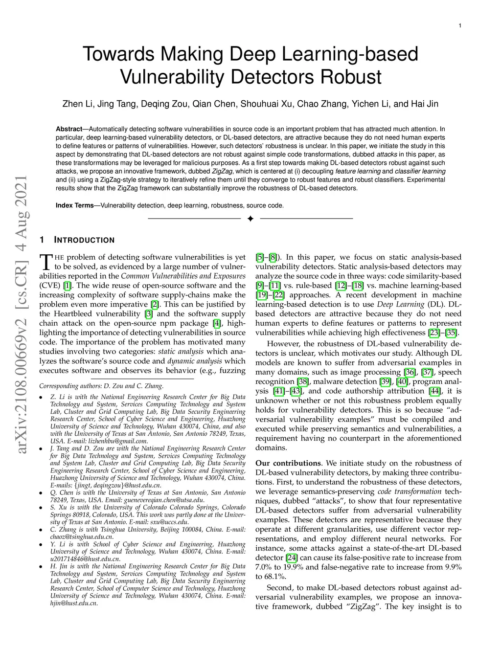 Automatically detecting software vulnerabilities in source code is an important problem that has attracted much attention. In particular, deep learning-based vulnerability detectors, or DL-based detectors, are attractive because they do not need human experts to define features or patterns of vulnerabilities. However, such detectors' robustness is unclear. In this paper, we initiate the study in this aspect by demonstrating that DL-based detectors are not robust against simple code transformations, dubbed attacks in this paper, as these transformations may be leveraged for malicious purposes. As a first step towards making DL-based detectors robust against such attacks, we propose an innovative framework, dubbed ZigZag, which is centered at (i) decoupling feature learning and classifier learning and (ii) using a ZigZag-style strategy to iteratively refine them until they converge to robust features and robust classifiers. Experimental results show that the ZigZag framework can substantially improve the robustness of DL-based detectors.