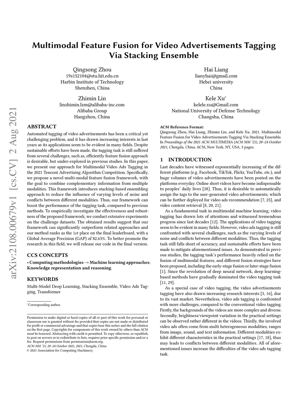 Multimodal Feature Fusion for Video Advertisements Tagging Via Stacking
