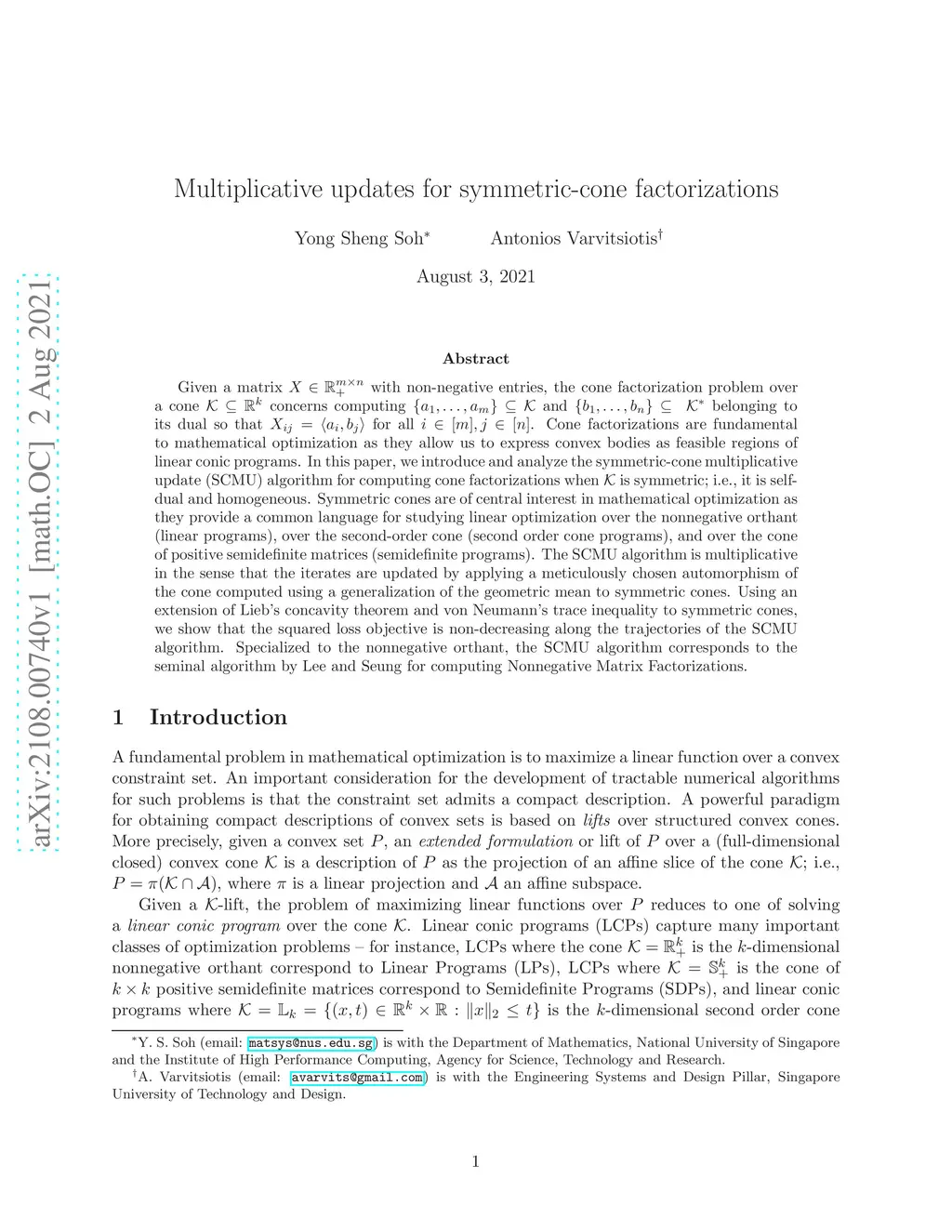 Given a matrix with non-negative entries, the cone factorization problem over a cone concerns computing and belonging to its dual so that for all . Cone factorizations are fundamental to mathematical optimization as they allow us to express convex bodies as feasible regions of linear conic programs. In this paper, we introduce and analyze the symmetric-cone multiplicative update (SCMU) algorithm for computing cone factorizations when is symmetric; i.e., it is self-dual and homogeneous. Symmetric cones are of central interest in mathematical optimization as they provide a common language for studying linear optimization over the nonnegative orthant (linear programs), over the second-order cone (second order cone programs), and over the cone of positive semidefinite matrices (semidefinite programs). The SCMU algorithm is multiplicative in the sense that the iterates are updated by applying a meticulously chosen automorphism of the cone computed using a generalization of the geometric mean to symmetric cones. Using an extension of Lieb's concavity theorem and von Neumann's trace inequality to symmetric cones, we show that the squared loss objective is non-decreasing along the trajectories of the SCMU algorithm. Specialized to the nonnegative orthant, the SCMU algorithm corresponds to the seminal algorithm by Lee and Seung for computing Nonnegative Matrix Factorizations.