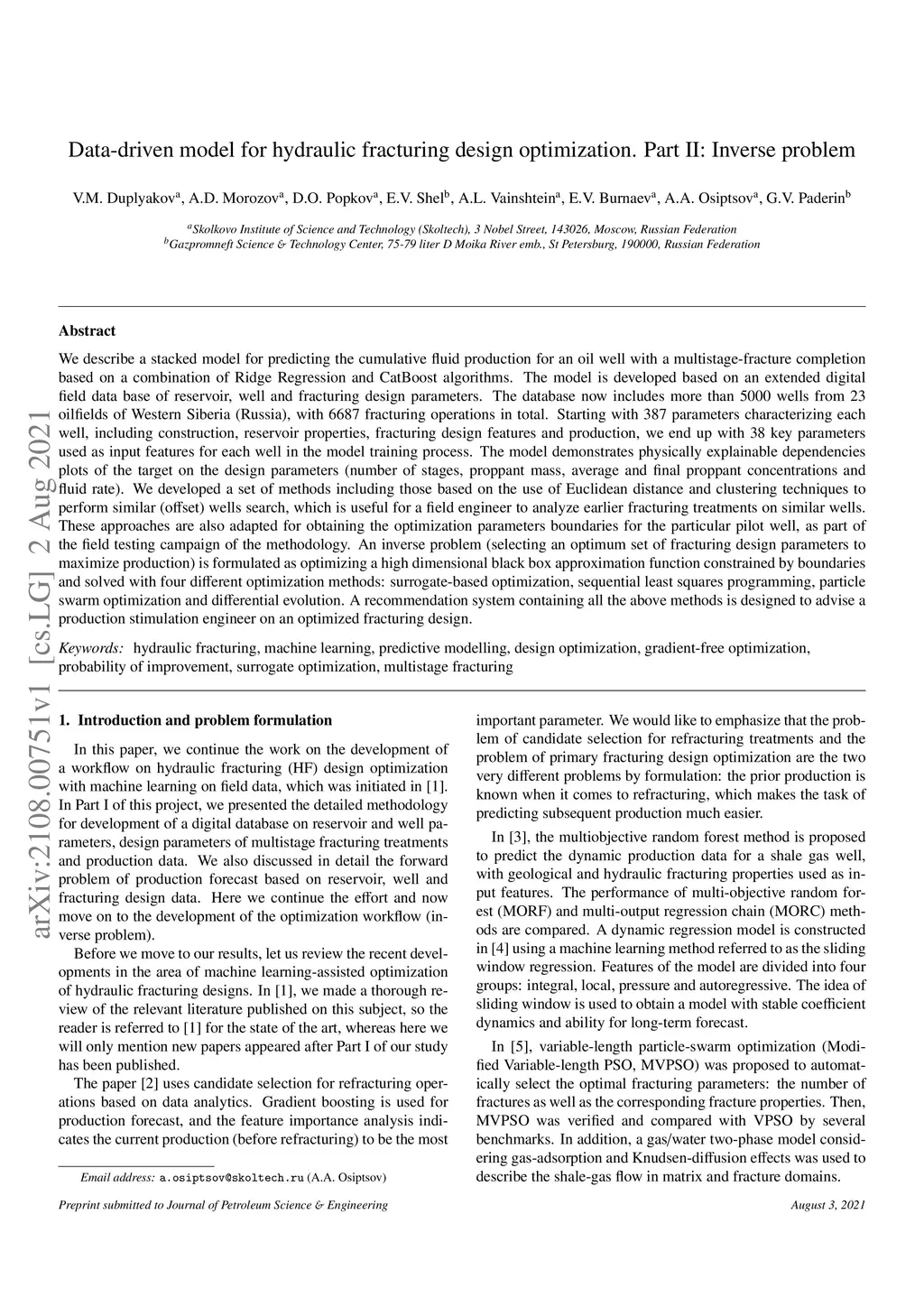 We describe a stacked model for predicting the cumulative fluid production for an oil well with a multistage-fracture completion based on a combination of Ridge Regression and CatBoost algorithms. The model is developed based on an extended digital field data base of reservoir, well and fracturing design parameters. The database now includes more than 5000 wells from 23 oilfields of Western Siberia (Russia), with 6687 fracturing operations in total. Starting with 387 parameters characterizing each well, including construction, reservoir properties, fracturing design features and production, we end up with 38 key parameters used as input features for each well in the model training process. The model demonstrates physically explainable dependencies plots of the target on the design parameters (number of stages, proppant mass, average and final proppant concentrations and fluid rate). We developed a set of methods including those based on the use of Euclidean distance and clustering techniques to perform similar (offset) wells search, which is useful for a field engineer to analyze earlier fracturing treatments on similar wells. These approaches are also adapted for obtaining the optimization parameters boundaries for the particular pilot well, as part of the field testing campaign of the methodology. An inverse problem (selecting an optimum set of fracturing design parameters to maximize production) is formulated as optimizing a high dimensional black box approximation function constrained by boundaries and solved with four different optimization methods: surrogate-based optimization, sequential least squares programming, particle swarm optimization and differential evolution. A recommendation system containing all the above methods is designed to advise a production stimulation engineer on an optimized fracturing design.