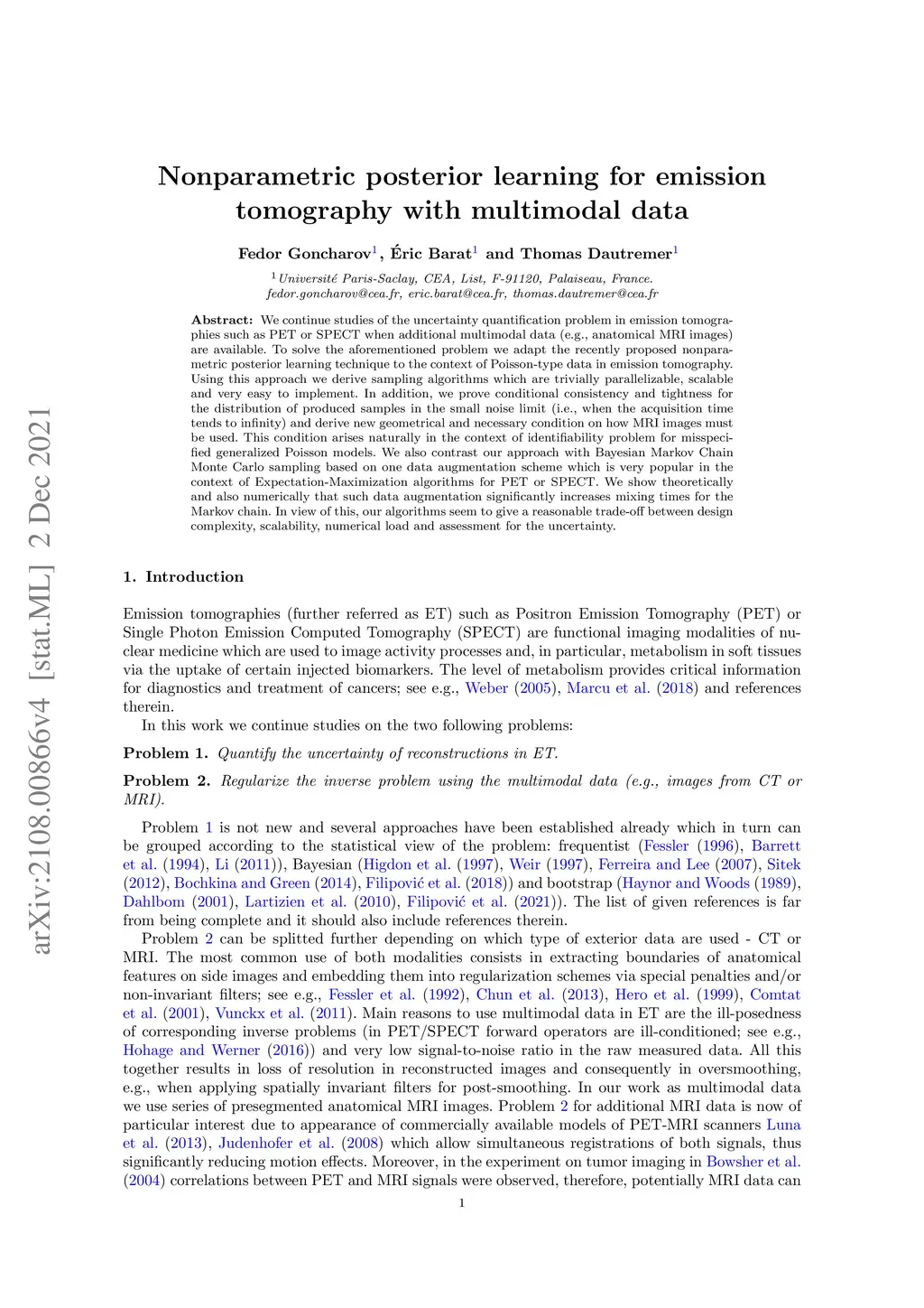 Nonparametric posterior learning for emission tomography with multimodal