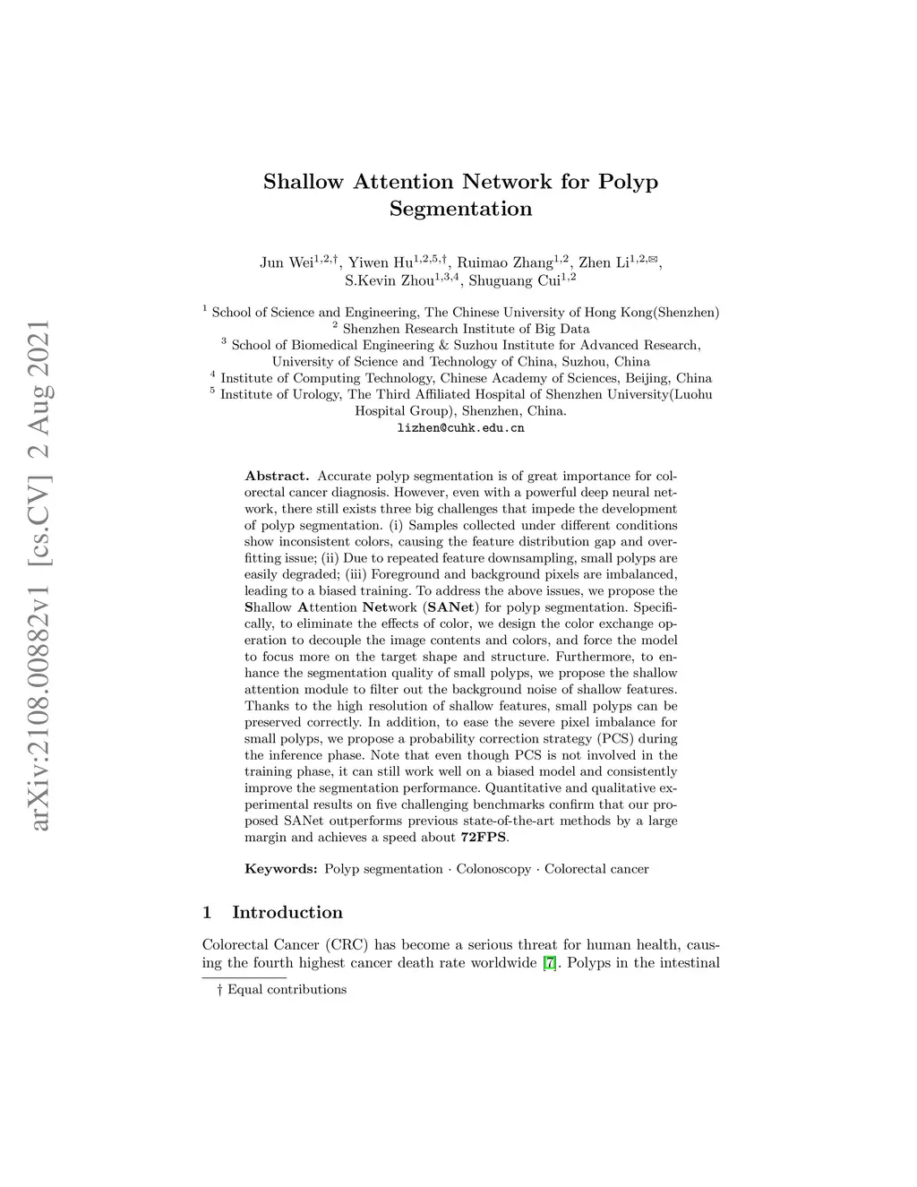 Accurate polyp segmentation is of great importance for colorectal cancer diagnosis. However, even with a powerful deep neural network, there still exists three big challenges that impede the development of polyp segmentation. (i) Samples collected under different conditions show inconsistent colors, causing the feature distribution gap and overfitting issue; (ii) Due to repeated feature downsampling, small polyps are easily degraded; (iii) Foreground and background pixels are imbalanced, leading to a biased training. To address the above issues, we propose the Shallow Attention Network (SANet) for polyp segmentation. Specifically, to eliminate the effects of color, we design the color exchange operation to decouple the image contents and colors, and force the model to focus more on the target shape and structure. Furthermore, to enhance the segmentation quality of small polyps, we propose the shallow attention module to filter out the background noise of shallow features. Thanks to the high resolution of shallow features, small polyps can be preserved correctly. In addition, to ease the severe pixel imbalance for small polyps, we propose a probability correction strategy (PCS) during the inference phase. Note that even though PCS is not involved in the training phase, it can still work well on a biased model and consistently improve the segmentation performance. Quantitative and qualitative experimental results on five challenging benchmarks confirm that our proposed SANet outperforms previous state-of-the-art methods by a large margin and achieves a speed about 72FPS.