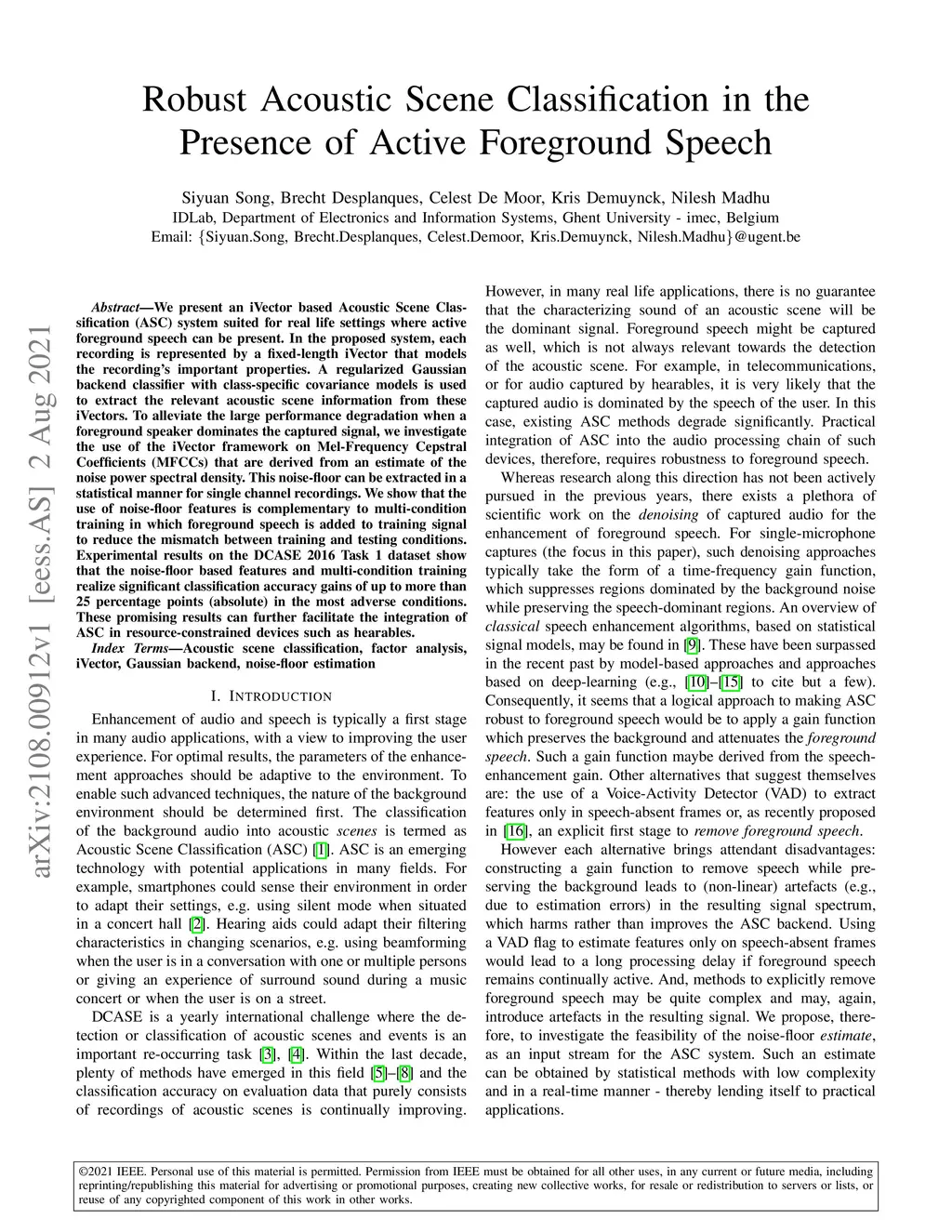 We present an iVector based Acoustic Scene Classification (ASC) system suited for real life settings where active foreground speech can be present. In the proposed system, each recording is represented by a fixed-length iVector that models the recording's important properties. A regularized Gaussian backend classifier with class-specific covariance models is used to extract the relevant acoustic scene information from these iVectors. To alleviate the large performance degradation when a foreground speaker dominates the captured signal, we investigate the use of the iVector framework on Mel-Frequency Cepstral Coefficients (MFCCs) that are derived from an estimate of the noise power spectral density. This noise-floor can be extracted in a statistical manner for single channel recordings. We show that the use of noise-floor features is complementary to multi-condition training in which foreground speech is added to training signal to reduce the mismatch between training and testing conditions. Experimental results on the DCASE 2016 Task 1 dataset show that the noise-floor based features and multi-condition training realize significant classification accuracy gains of up to more than 25 percentage points (absolute) in the most adverse conditions. These promising results can further facilitate the integration of ASC in resource-constrained devices such as hearables.