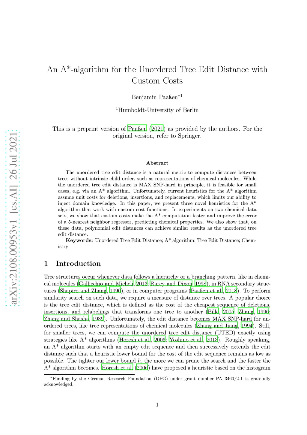 An A*-algorithm for the Unordered Tree Edit Distance with Custom Costs