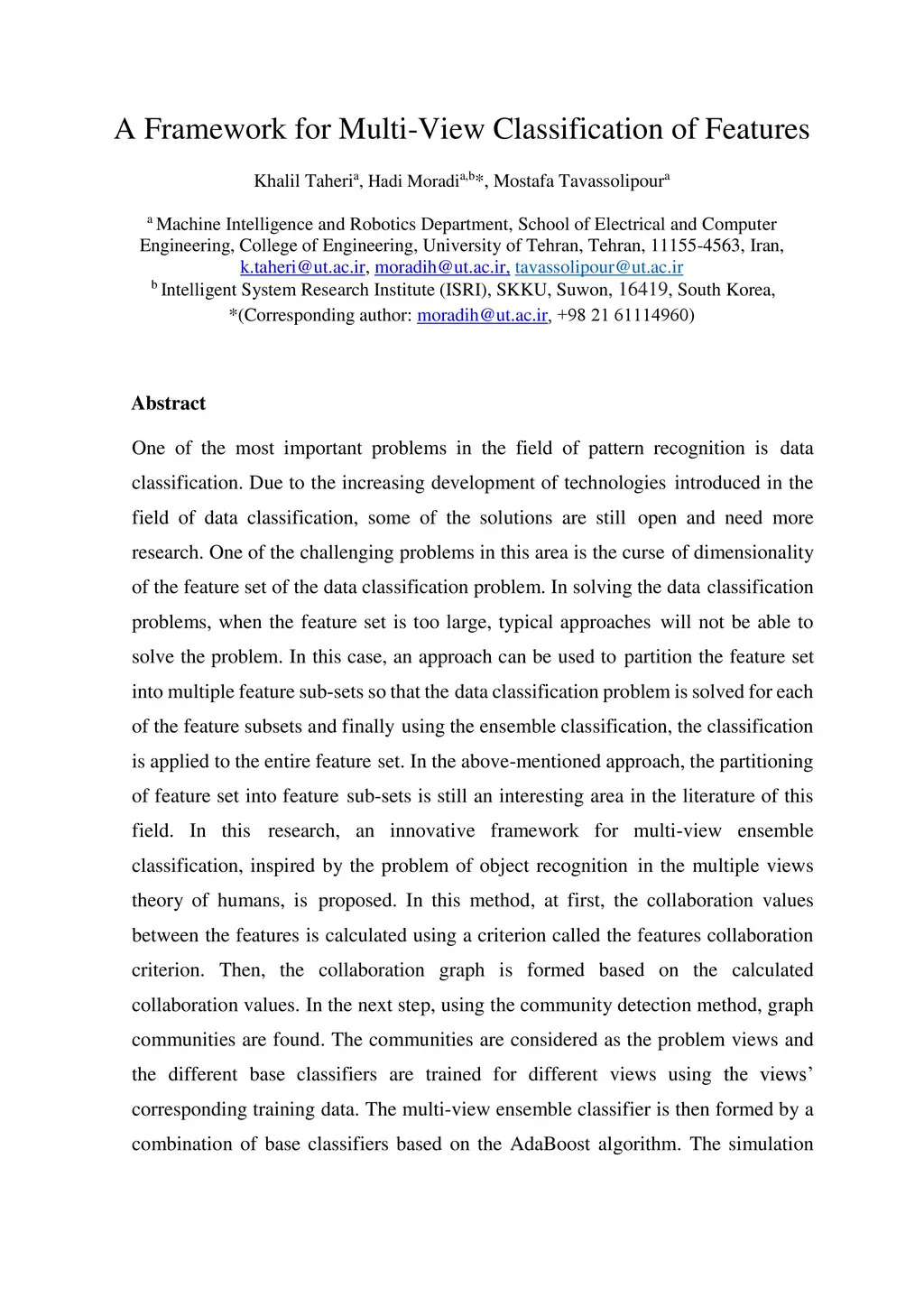 One of the most important problems in the field of pattern recognition is data classification. Due to the increasing development of technologies introduced in the field of data classification, some of the solutions are still open and need more research. One of the challenging problems in this area is the curse of dimensionality of the feature set of the data classification problem. In solving the data classification problems, when the feature set is too large, typical approaches will not be able to solve the problem. In this case, an approach can be used to partition the feature set into multiple feature sub-sets so that the data classification problem is solved for each of the feature subsets and finally using the ensemble classification, the classification is applied to the entire feature set. In the above-mentioned approach, the partitioning of feature set into feature sub-sets is still an interesting area in the literature of this field. In this research, an innovative framework for multi-view ensemble classification, inspired by the problem of object recognition in the multiple views theory of humans, is proposed. In this method, at first, the collaboration values between the features is calculated using a criterion called the features collaboration criterion. Then, the collaboration graph is formed based on the calculated collaboration values. In the next step, using the community detection method, graph communities are found. The communities are considered as the problem views and the different base classifiers are trained for different views using the views corresponding training data. The multi-view ensemble classifier is then formed by a combination of base classifiers based on the AdaBoost algorithm. The simulation results of the proposed method on the real and synthetic datasets show that the proposed method increases the classification accuracy.