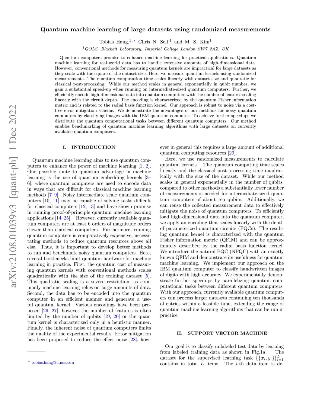 Quantum computers promise to enhance machine learning for practical applications. Quantum machine learning for real-world data has to handle extensive amounts of high-dimensional data. However, conventional methods for measuring quantum kernels are impractical for large datasets as they scale with the square of the dataset size. Here, we measure quantum kernels using randomized measurements. The quantum computation time scales linearly with dataset size and quadratic for classical post-processing. While our method scales in general exponentially in qubit number, we gain a substantial speed-up when running on intermediate-sized quantum computers. Further, we efficiently encode high-dimensional data into quantum computers with the number of features scaling linearly with the circuit depth. The encoding is characterized by the quantum Fisher information metric and is related to the radial basis function kernel. Our approach is robust to noise via a cost-free error mitigation scheme. We demonstrate the advantages of our methods for noisy quantum computers by classifying images with the IBM quantum computer. To achieve further speedups we distribute the quantum computational tasks between different quantum computers. Our method enables benchmarking of quantum machine learning algorithms with large datasets on currently available quantum computers.