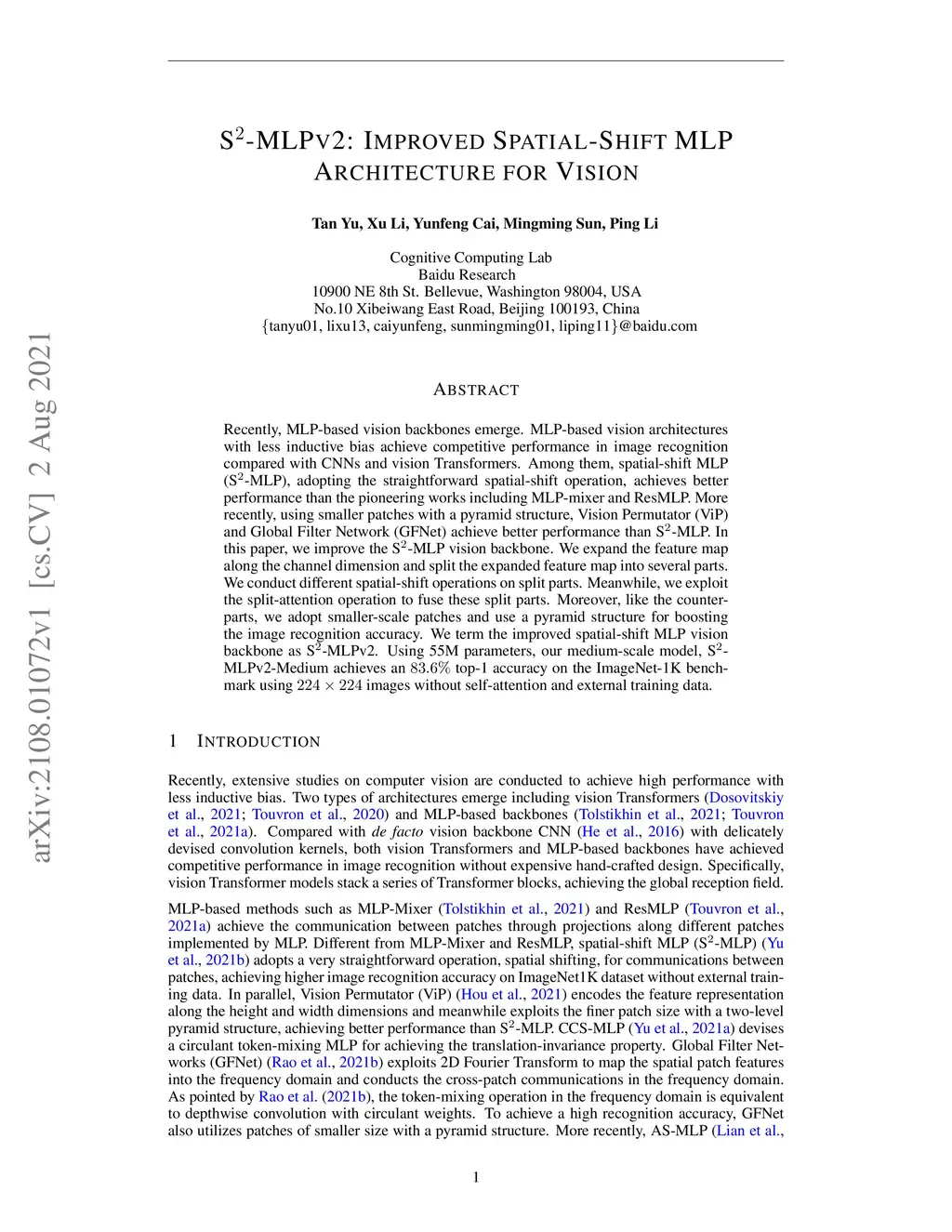 Recently, MLP-based vision backbones emerge. MLP-based vision architectures with less inductive bias achieve competitive performance in image recognition compared with CNNs and vision Transformers. Among them, spatial-shift MLP (S-MLP), adopting the straightforward spatial-shift operation, achieves better performance than the pioneering works including MLP-mixer and ResMLP. More recently, using smaller patches with a pyramid structure, Vision Permutator (ViP) and Global Filter Network (GFNet) achieve better performance than S-MLP. In this paper, we improve the S-MLP vision backbone. We expand the feature map along the channel dimension and split the expanded feature map into several parts. We conduct different spatial-shift operations on split parts. Meanwhile, we exploit the split-attention operation to fuse these split parts. Moreover, like the counterparts, we adopt smaller-scale patches and use a pyramid structure for boosting the image recognition accuracy. We term the improved spatial-shift MLP vision backbone as S-MLPv2. Using 55M parameters, our medium-scale model, S-MLPv2-Medium achieves an top-1 accuracy on the ImageNet-1K benchmark using images without self-attention and external training data.