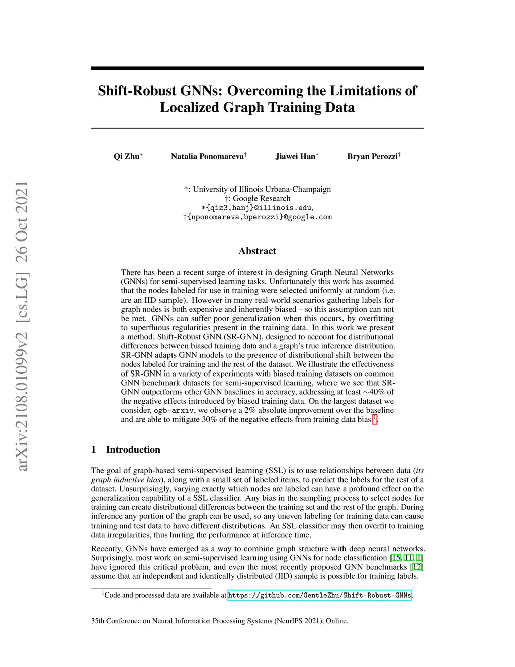 There has been a recent surge of interest in designing Graph Neural Networks (GNNs) for semi-supervised learning tasks. Unfortunately this work has assumed that the nodes labeled for use in training were selected uniformly at random (i.e. are an IID sample). However in many real world scenarios gathering labels for graph nodes is both expensive and inherently biased -- so this assumption can not be met. GNNs can suffer poor generalization when this occurs, by overfitting to superfluous regularities present in the training data. In this work we present a method, Shift-Robust GNN (SR-GNN), designed to account for distributional differences between biased training data and the graph's true inference distribution. SR-GNN adapts GNN models for the presence of distributional shifts between the nodes which have had labels provided for training and the rest of the dataset. We illustrate the effectiveness of SR-GNN in a variety of experiments with biased training datasets on common GNN benchmark datasets for semi-supervised learning, where we see that SR-GNN outperforms other GNN baselines by accuracy, eliminating at least (~40%) of the negative effects introduced by biased training data. On the largest dataset we consider, ogb-arxiv, we observe an 2% absolute improvement over the baseline and reduce 30% of the negative effects.