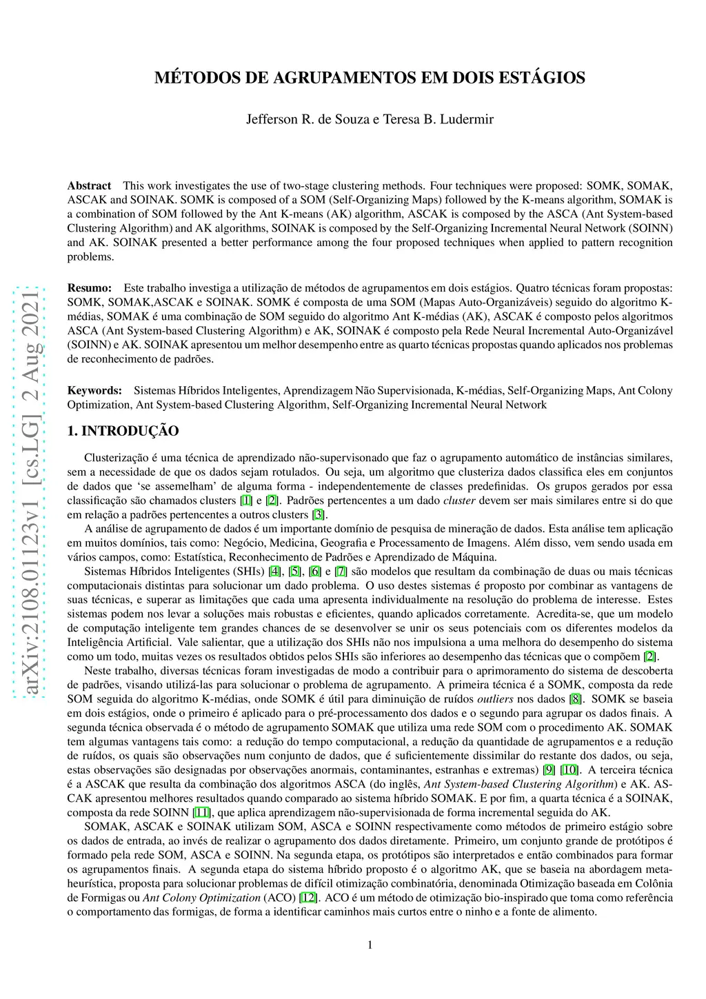 This work investigates the use of two-stage clustering methods. Four techniques were proposed: SOMK, SOMAK, ASCAK and SOINAK. SOMK is composed of a SOM (Self-Organizing Maps) followed by the K-means algorithm, SOMAK is a combination of SOM followed by the Ant K-means (AK) algorithm, ASCAK is composed by the ASCA (Ant System-based Clustering Algorithm) and AK algorithms, SOINAK is composed by the Self-Organizing Incremental Neural Network (SOINN) and AK. SOINAK presented a better performance among the four proposed techniques when applied to pattern recognition problems.