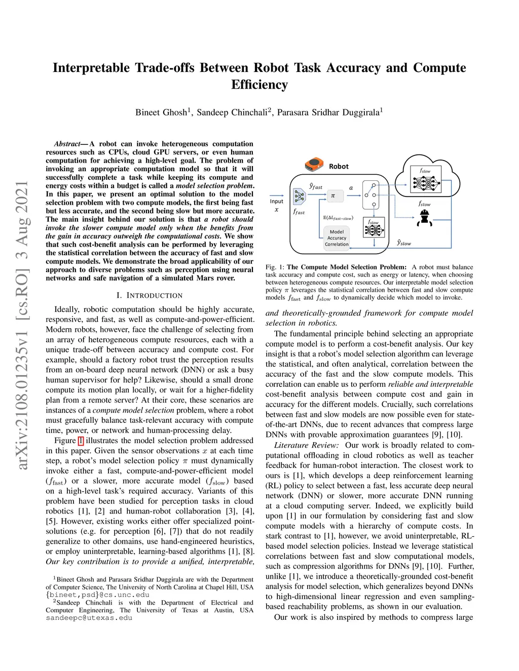 A robot can invoke heterogeneous computation resources such as CPUs, cloud GPU servers, or even human computation for achieving a high-level goal. The problem of invoking an appropriate computation model so that it will successfully complete a task while keeping its compute and energy costs within a budget is called a model selection problem. In this paper, we present an optimal solution to the model selection problem with two compute models, the first being fast but less accurate, and the second being slow but more accurate. The main insight behind our solution is that a robot should invoke the slower compute model only when the benefits from the gain in accuracy outweigh the computational costs. We show that such cost-benefit analysis can be performed by leveraging the statistical correlation between the accuracy of fast and slow compute models. We demonstrate the broad applicability of our approach to diverse problems such as perception using neural networks and safe navigation of a simulated Mars rover.