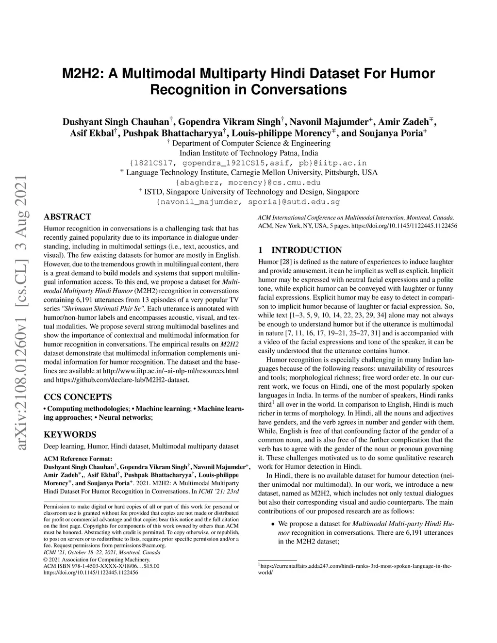 M2H2: A Multimodal Multiparty Hindi Dataset For Humor Recognition in