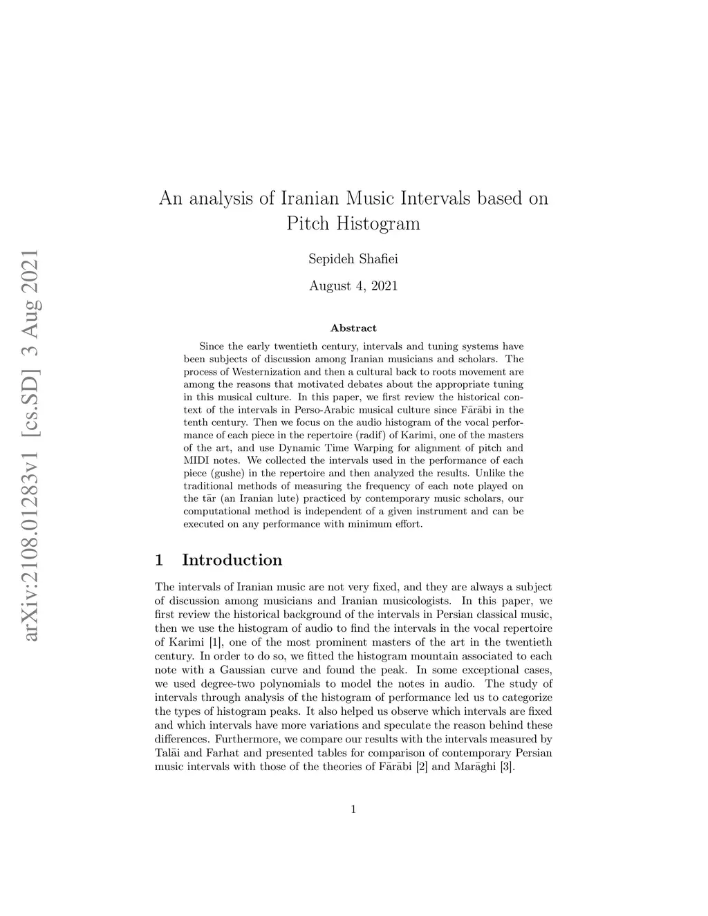 Since the early twentieth century, intervals and tuning systems have been subjects of discussion among Iranian musicians and scholars. The process of Westernization and then a cultural back to roots movement are among the reasons that motivated debates about the appropriate tuning in this musical culture. In this paper, we first review the historical context of the intervals in Perso-Arabic musical culture since Farabi in the tenth century. Then we focus on the audio histogram of the vocal performance of each piece in the repertoire (radif) of Karimi, one of the masters of the art, and use Dynamic Time Warping for alignment of pitch and MIDI notes. We collected the intervals used in the performance of each piece (gushe) in the repertoire and then analyzed the results. Unlike the traditional methods of measuring the frequency of each note played on the tar (an Iranian lute) practiced by contemporary music scholars, our computational method is independent of a given instrument and can be executed on any performance with minimum effort.