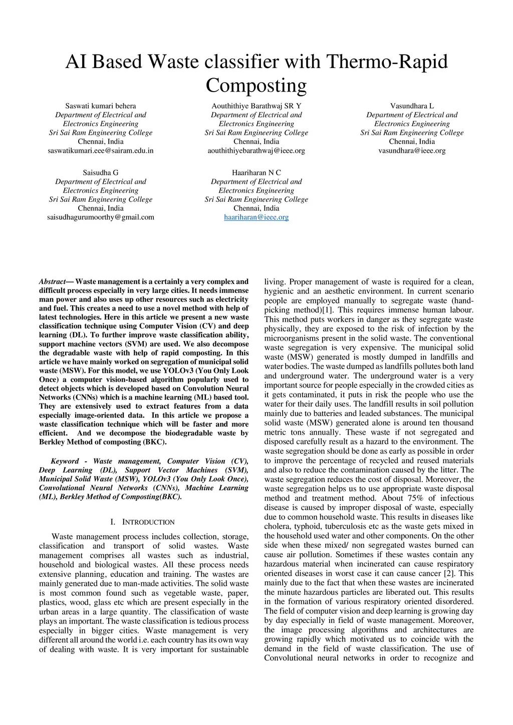 Waste management is a certainly a very complex and difficult process especially in very large cities. It needs immense man power and also uses up other resources such as electricity and fuel. This creates a need to use a novel method with help of latest technologies. Here in this article we present a new waste classification technique using Computer Vision (CV) and deep learning (DL). To further improve waste classification ability, support machine vectors (SVM) are used. We also decompose the degradable waste with help of rapid composting. In this article we have mainly worked on segregation of municipal solid waste (MSW). For this model, we use YOLOv3 (You Only Look Once) a computer vision-based algorithm popularly used to detect objects which is developed based on Convolution Neural Networks (CNNs) which is a machine learning (ML) based tool. They are extensively used to extract features from a data especially image-oriented data. In this article we propose a waste classification technique which will be faster and more efficient. And we decompose the biodegradable waste by Berkley Method of composting (BKC)