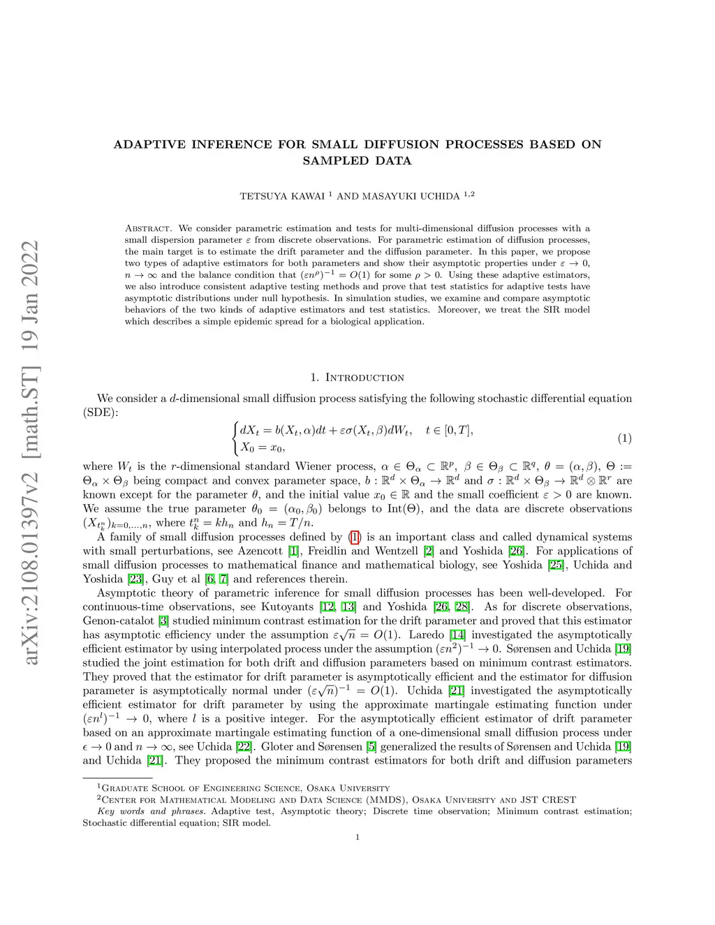 We consider parametric estimation and tests for multi-dimensional diffusion processes with a small dispersion parameter from discrete observations. For parametric estimation of diffusion processes, the main target is to estimate the drift parameter and the diffusion parameter. In this paper, we propose two types of adaptive estimators for both parameters and show their asymptotic properties under , and the balance condition that for some . Using these adaptive estimators, we also introduce consistent adaptive testing methods and prove that test statistics for adaptive tests have asymptotic distributions under null hypothesis. In simulation studies, we examine and compare asymptotic behaviors of the two kinds of adaptive estimators and test statistics. Moreover, we treat the SIR model which describes a simple epidemic spread for a biological application.