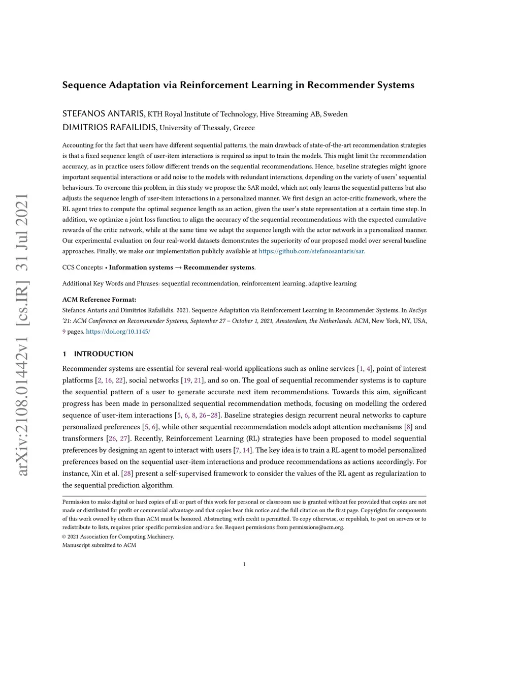 Accounting for the fact that users have different sequential patterns, the main drawback of state-of-the-art recommendation strategies is that a fixed sequence length of user-item interactions is required as input to train the models. This might limit the recommendation accuracy, as in practice users follow different trends on the sequential recommendations. Hence, baseline strategies might ignore important sequential interactions or add noise to the models with redundant interactions, depending on the variety of users' sequential behaviours. To overcome this problem, in this study we propose the SAR model, which not only learns the sequential patterns but also adjusts the sequence length of user-item interactions in a personalized manner. We first design an actor-critic framework, where the RL agent tries to compute the optimal sequence length as an action, given the user's state representation at a certain time step. In addition, we optimize a joint loss function to align the accuracy of the sequential recommendations with the expected cumulative rewards of the critic network, while at the same time we adapt the sequence length with the actor network in a personalized manner. Our experimental evaluation on four real-world datasets demonstrates the superiority of our proposed model over several baseline approaches. Finally, we make our implementation publicly available at https://github.com/stefanosantaris/sar.