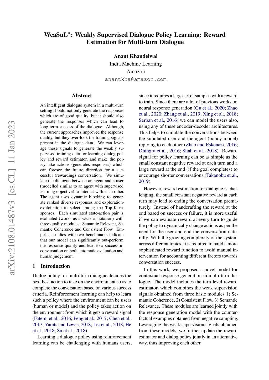 An intelligent dialogue system in a multi-turn setting should not only generate the responses which are of good quality, but it should also generate the responses which can lead to long-term success of the dialogue. Although, the current approaches improved the response quality, but they over-look the training signals present in the dialogue data. We can leverage these signals to generate the weakly supervised training data for learning dialog policy and reward estimator, and make the policy take actions (generates responses) which can foresee the future direction for a successful (rewarding) conversation. We simulate the dialogue between an agent and a user (modelled similar to an agent with supervised learning objective) to interact with each other. The agent uses dynamic blocking to generate ranked diverse responses and exploration-exploitation to select among the Top-K responses. Each simulated state-action pair is evaluated (works as a weak annotation) with three quality modules: Semantic Relevant, Semantic Coherence and Consistent Flow. Empirical studies with two benchmarks indicate that our model can significantly out-perform the response quality and lead to a successful conversation on both automatic evaluation and human judgement.